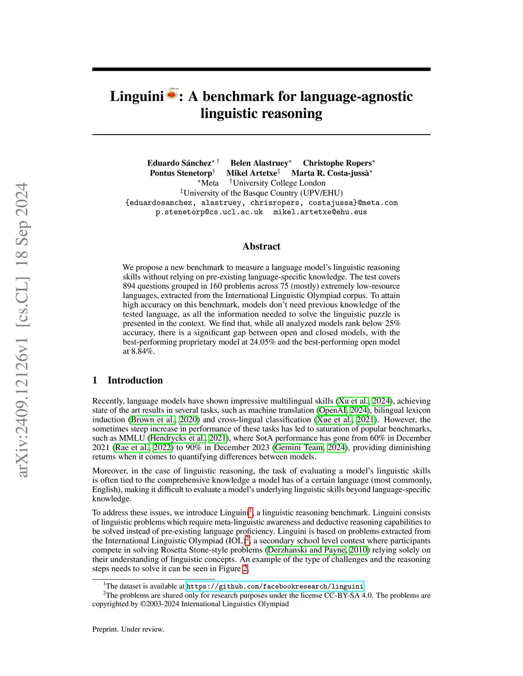 We propose a new benchmark to measure a language model's linguistic reasoning skills without relying on pre-existing language-specific knowledge. The test covers 894 questions grouped in 160 problems across 75 (mostly) extremely low-resource languages, extracted from the International Linguistic Olympiad corpus. To attain high accuracy on this benchmark, models don't need previous knowledge of the tested language, as all the information needed to solve the linguistic puzzle is presented in the context. We find that, while all analyzed models rank below 25% accuracy, there is a significant gap between open and closed models, with the best-performing proprietary model at 24.05% and the best-performing open model at 8.84%.