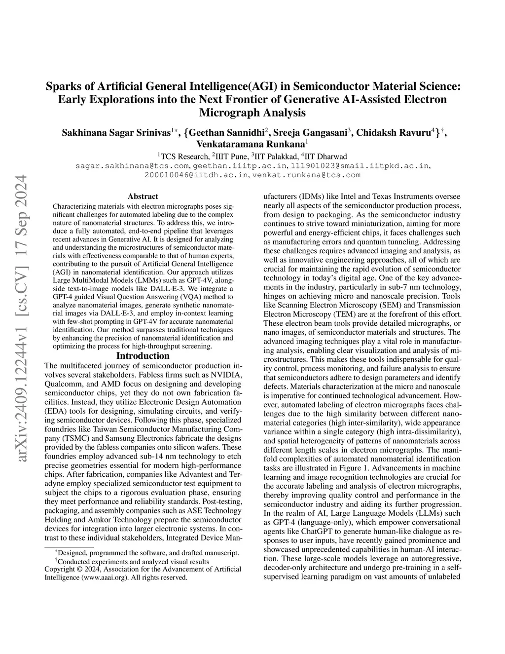 Characterizing materials with electron micrographs poses significant challenges for automated labeling due to the complex nature of nanomaterial structures. To address this, we introduce a fully automated, end-to-end pipeline that leverages recent advances in Generative AI. It is designed for analyzing and understanding the microstructures of semiconductor materials with effectiveness comparable to that of human experts, contributing to the pursuit of Artificial General Intelligence (AGI) in nanomaterial identification. Our approach utilizes Large MultiModal Models (LMMs) such as GPT-4V, alongside text-to-image models like DALLE-3. We integrate a GPT-4 guided Visual Question Answering (VQA) method to analyze nanomaterial images, generate synthetic nanomaterial images via DALLE-3, and employ in-context learning with few-shot prompting in GPT-4V for accurate nanomaterial identification. Our method surpasses traditional techniques by enhancing the precision of nanomaterial identification and optimizing the process for high-throughput screening.