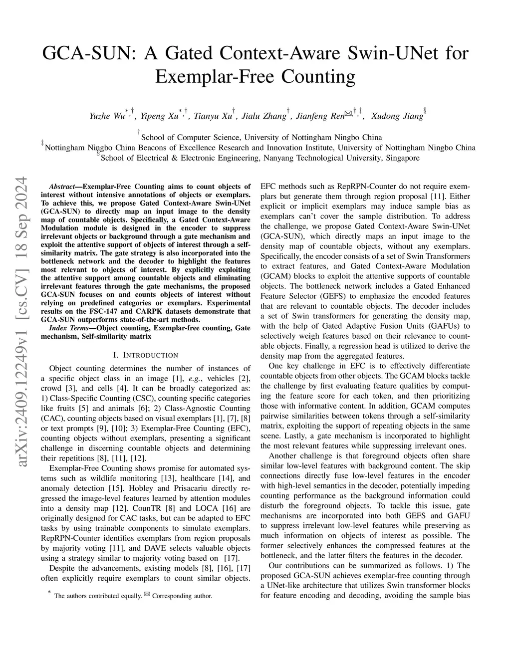 GCA-SUNet: A Gated Context-Aware Swin-UNet for Exemplar-Free Counting