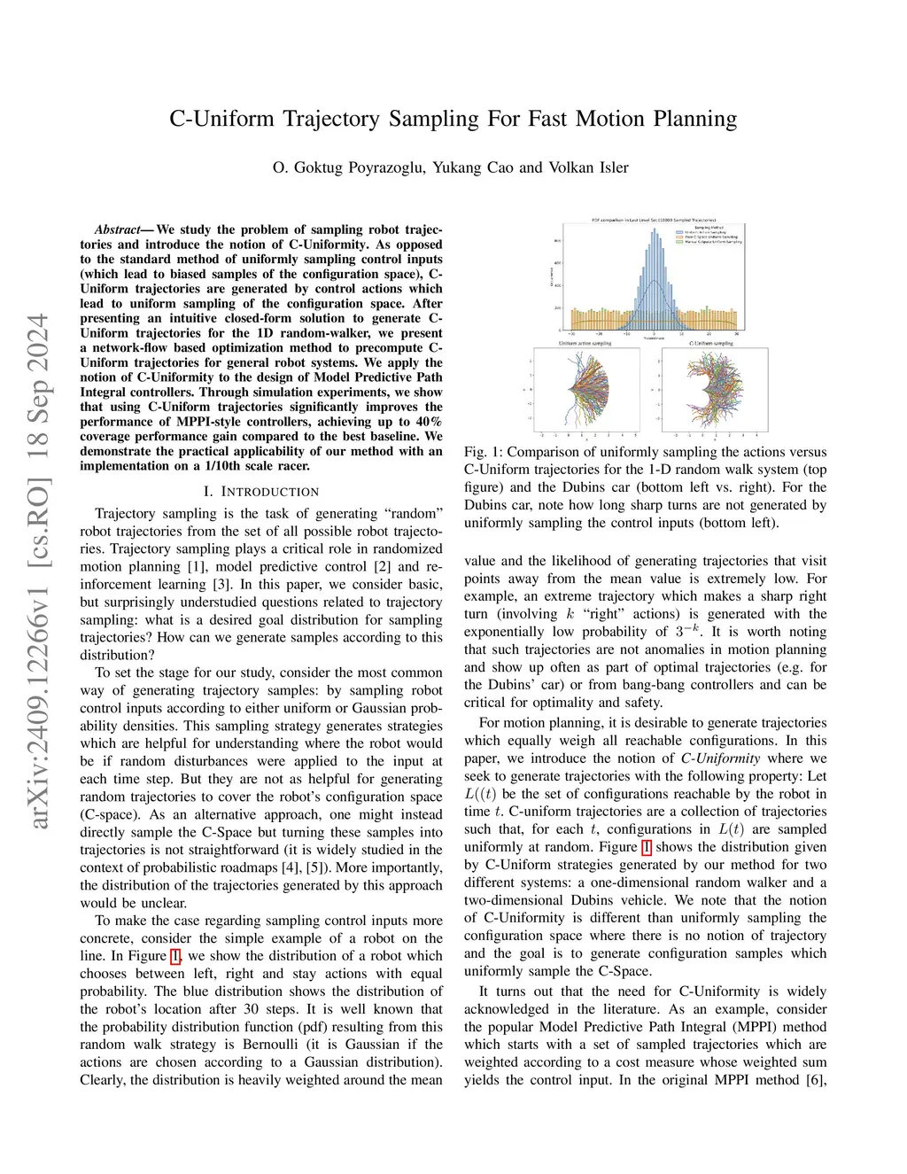We study the problem of sampling robot trajectories and introduce the notion of C-Uniformity. As opposed to the standard method of uniformly sampling control inputs (which lead to biased samples of the configuration space), C-Uniform trajectories are generated by control actions which lead to uniform sampling of the configuration space. After presenting an intuitive closed-form solution to generate C-Uniform trajectories for the 1D random-walker, we present a network-flow based optimization method to precompute C-Uniform trajectories for general robot systems. We apply the notion of C-Uniformity to the design of Model Predictive Path Integral controllers. Through simulation experiments, we show that using C-Uniform trajectories significantly improves the performance of MPPI-style controllers, achieving up to 40% coverage performance gain compared to the best baseline. We demonstrate the practical applicability of our method with an implementation on a 1/10th scale racer.