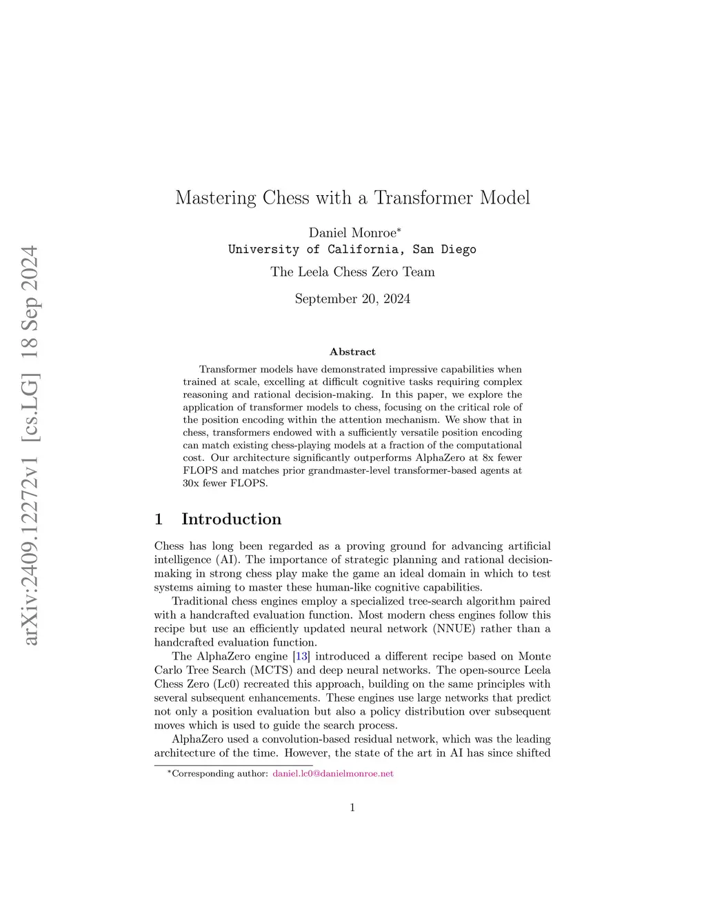Transformer models have demonstrated impressive capabilities when trained at scale, excelling at difficult cognitive tasks requiring complex reasoning and rational decision-making. In this paper, we explore the application of transformers to chess, focusing on the critical role of the position representation within the attention mechanism. We show that transformers endowed with a sufficiently expressive position representation can match existing chess-playing models at a fraction of the computational cost. Our architecture, which we call the Chessformer, significantly outperforms AlphaZero in both playing strength and puzzle solving ability with 8x less computation and matches prior grandmaster-level transformer-based agents in those metrics with 30x less computation. Our models also display an understanding of chess dissimilar and orthogonal to that of top traditional engines, detecting high-level positional features like trapped pieces and fortresses that those engines struggle with. This work demonstrates that domain-specific enhancements can in large part replace the need for model scale, while also highlighting that deep learning can make strides even in areas dominated by search-based methods.