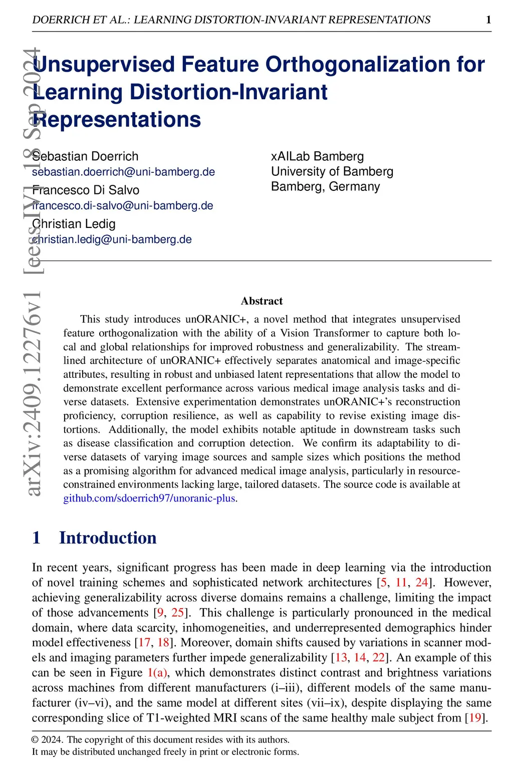 This study introduces unORANIC+, a novel method that integrates unsupervised feature orthogonalization with the ability of a Vision Transformer to capture both local and global relationships for improved robustness and generalizability. The streamlined architecture of unORANIC+ effectively separates anatomical and image-specific attributes, resulting in robust and unbiased latent representations that allow the model to demonstrate excellent performance across various medical image analysis tasks and diverse datasets. Extensive experimentation demonstrates unORANIC+'s reconstruction proficiency, corruption resilience, as well as capability to revise existing image distortions. Additionally, the model exhibits notable aptitude in downstream tasks such as disease classification and corruption detection. We confirm its adaptability to diverse datasets of varying image sources and sample sizes which positions the method as a promising algorithm for advanced medical image analysis, particularly in resource-constrained environments lacking large, tailored datasets. The source code is available at https://github.com/sdoerrich97/unoranic-plus .