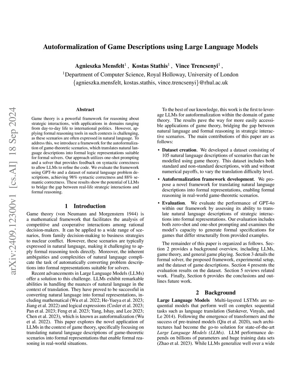 Game theory is a powerful framework for reasoning about strategic interactions, with applications in domains ranging from day-to-day life to international politics. However, applying formal reasoning tools in such contexts is challenging, as these scenarios are often expressed in natural language. To address this, we introduce a framework for the autoformalization of game-theoretic scenarios, which translates natural language descriptions into formal logic representations suitable for formal solvers. Our approach utilizes one-shot prompting and a solver that provides feedback on syntactic correctness to allow LLMs to refine the code. We evaluate the framework using GPT-4o and a dataset of natural language problem descriptions, achieving 98% syntactic correctness and 88% semantic correctness. These results show the potential of LLMs to bridge the gap between real-life strategic interactions and formal reasoning.