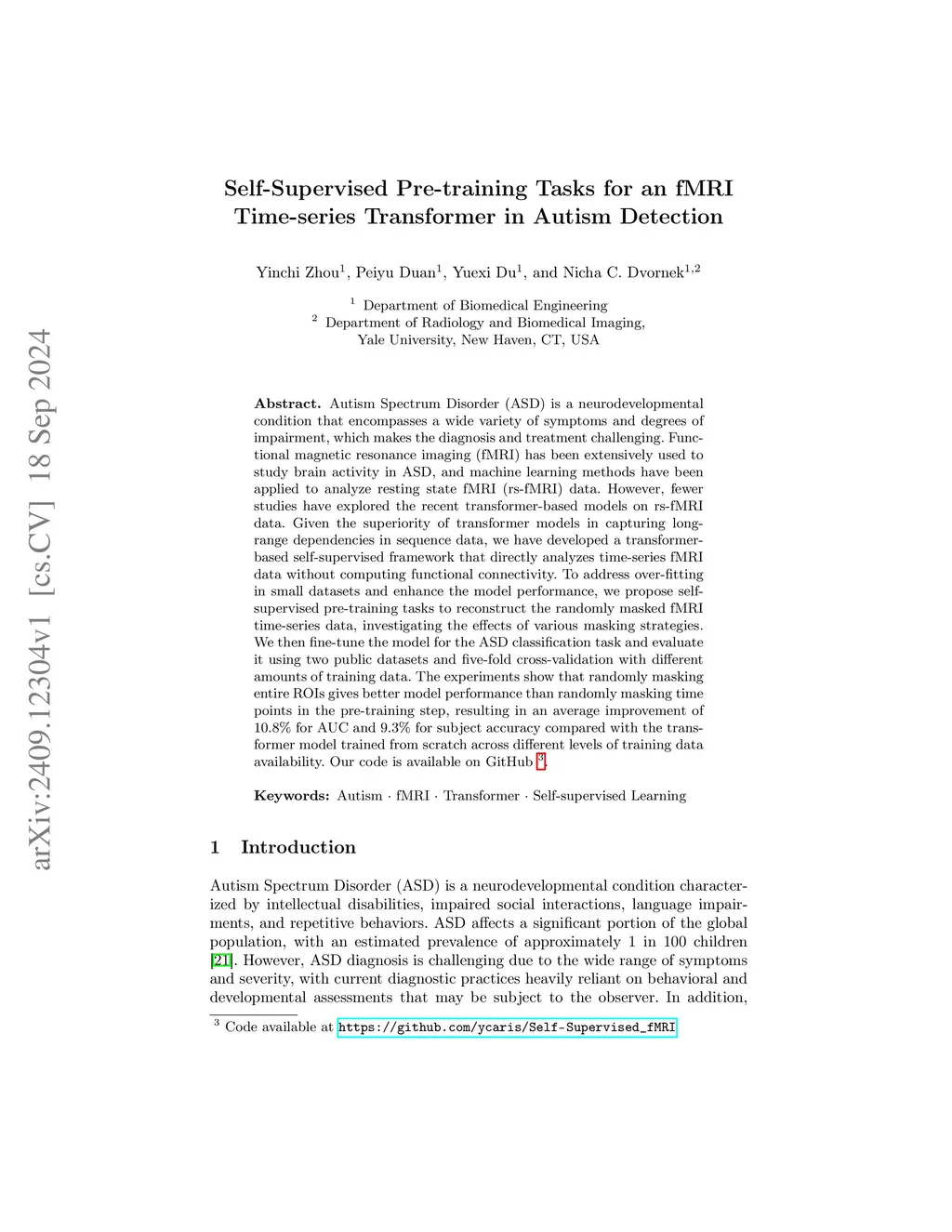 Autism Spectrum Disorder (ASD) is a neurodevelopmental condition that encompasses a wide variety of symptoms and degrees of impairment, which makes the diagnosis and treatment challenging. Functional magnetic resonance imaging (fMRI) has been extensively used to study brain activity in ASD, and machine learning methods have been applied to analyze resting state fMRI (rs-fMRI) data. However, fewer studies have explored the recent transformer-based models on rs-fMRI data. Given the superiority of transformer models in capturing long-range dependencies in sequence data, we have developed a transformer-based self-supervised framework that directly analyzes time-series fMRI data without computing functional connectivity. To address over-fitting in small datasets and enhance the model performance, we propose self-supervised pre-training tasks to reconstruct the randomly masked fMRI time-series data, investigating the effects of various masking strategies. We then finetune the model for the ASD classification task and evaluate it using two public datasets and five-fold cross-validation with different amounts of training data. The experiments show that randomly masking entire ROIs gives better model performance than randomly masking time points in the pre-training step, resulting in an average improvement of 10.8% for AUC and 9.3% for subject accuracy compared with the transformer model trained from scratch across different levels of training data availability. Our code is available on GitHub.