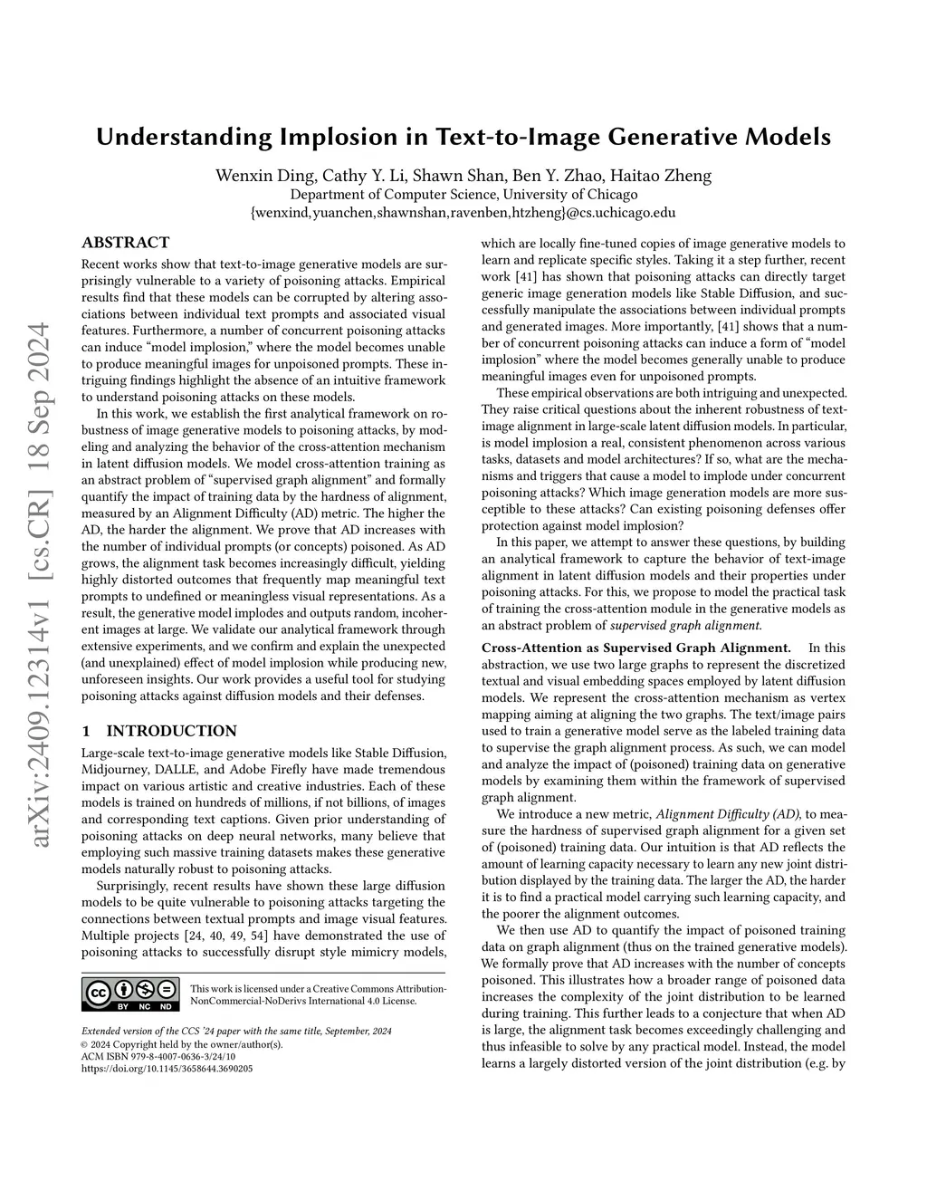 Recent works show that text-to-image generative models are surprisingly vulnerable to a variety of poisoning attacks. Empirical results find that these models can be corrupted by altering associations between individual text prompts and associated visual features. Furthermore, a number of concurrent poisoning attacks can induce "model implosion," where the model becomes unable to produce meaningful images for unpoisoned prompts. These intriguing findings highlight the absence of an intuitive framework to understand poisoning attacks on these models. In this work, we establish the first analytical framework on robustness of image generative models to poisoning attacks, by modeling and analyzing the behavior of the cross-attention mechanism in latent diffusion models. We model cross-attention training as an abstract problem of "supervised graph alignment" and formally quantify the impact of training data by the hardness of alignment, measured by an Alignment Difficulty (AD) metric. The higher the AD, the harder the alignment. We prove that AD increases with the number of individual prompts (or concepts) poisoned. As AD grows, the alignment task becomes increasingly difficult, yielding highly distorted outcomes that frequently map meaningful text prompts to undefined or meaningless visual representations. As a result, the generative model implodes and outputs random, incoherent images at large. We validate our analytical framework through extensive experiments, and we confirm and explain the unexpected (and unexplained) effect of model implosion while producing new, unforeseen insights. Our work provides a useful tool for studying poisoning attacks against diffusion models and their defenses.