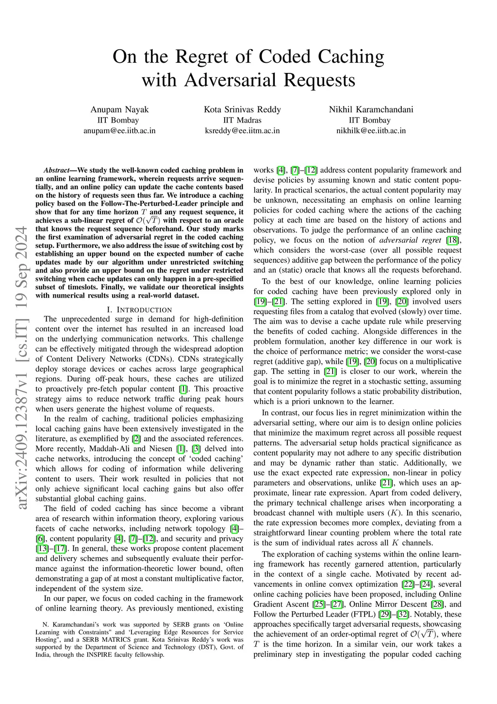 We study the well-known coded caching problem in an online learning framework, wherein requests arrive sequentially, and an online policy can update the cache contents based on the history of requests seen thus far. We introduce a caching policy based on the Follow-The-Perturbed-Leader principle and show that for any time horizon T and any request sequence, it achieves a sub-linear regret of \mathcal{O}(\sqrt(T) ) with respect to an oracle that knows the request sequence beforehand. Our study marks the first examination of adversarial regret in the coded caching setup. Furthermore, we also address the issue of switching cost by establishing an upper bound on the expected number of cache updates made by our algorithm under unrestricted switching and also provide an upper bound on the regret under restricted switching when cache updates can only happen in a pre-specified subset of timeslots. Finally, we validate our theoretical insights with numerical results using a real-world dataset