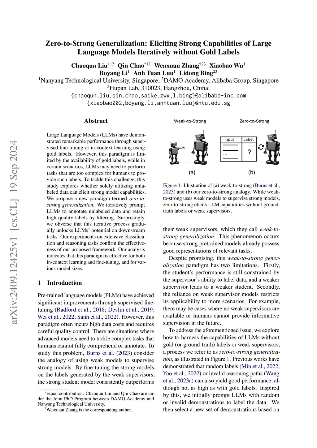 Large Language Models (LLMs) have demonstrated remarkable performance through supervised fine-tuning or in-context learning using gold labels. However, this paradigm is limited by the availability of gold labels, while in certain scenarios, LLMs may need to perform tasks that are too complex for humans to provide such labels. To tackle this challenge, this study explores whether solely utilizing unlabeled data can elicit strong model capabilities. We propose a new paradigm termed zero-to-strong generalization. We iteratively prompt LLMs to annotate unlabeled data and retain high-quality labels by filtering. Surprisingly, we obverse that this iterative process gradually unlocks LLMs' potential on downstream tasks. Our experiments on extensive classification and reasoning tasks confirm the effectiveness of our proposed framework. Our analysis indicates that this paradigm is effective for both in-context learning and fine-tuning, and for various model sizes.