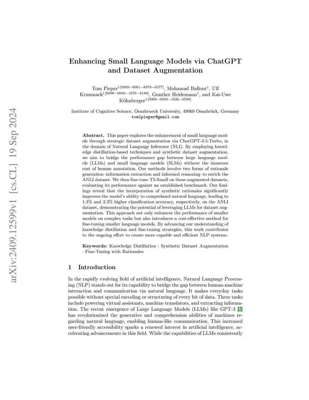 This paper explores the enhancement of small language models through strategic dataset augmentation via ChatGPT-3.5-Turbo, in the domain of Natural Language Inference (NLI). By employing knowledge distillation-based techniques and synthetic dataset augmentation, we aim to bridge the performance gap between large language models (LLMs) and small language models (SLMs) without the immense cost of human annotation. Our methods involve two forms of rationale generation--information extraction and informed reasoning--to enrich the ANLI dataset. We then fine-tune T5-Small on these augmented datasets, evaluating its performance against an established benchmark. Our findings reveal that the incorporation of synthetic rationales significantly improves the model's ability to comprehend natural language, leading to 1.3\% and 2.3\% higher classification accuracy, respectively, on the ANLI dataset, demonstrating the potential of leveraging LLMs for dataset augmentation. This approach not only enhances the performance of smaller models on complex tasks but also introduces a cost-effective method for fine-tuning smaller language models. By advancing our understanding of knowledge distillation and fine-tuning strategies, this work contributes to the ongoing effort to create more capable and efficient NLP systems.