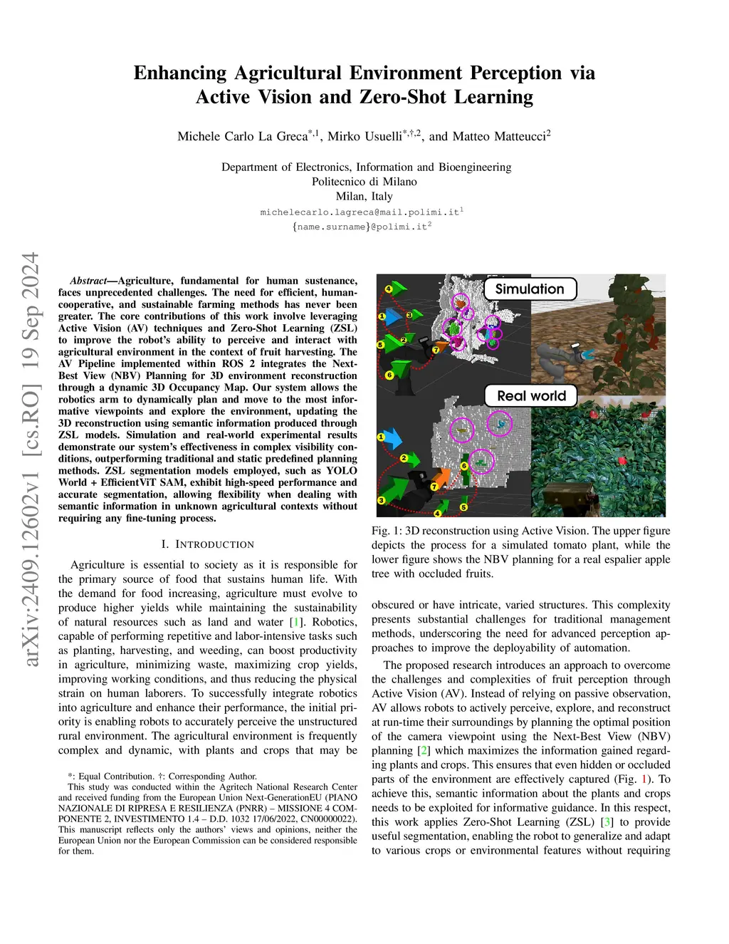 Agriculture, fundamental for human sustenance, faces unprecedented challenges. The need for efficient, human-cooperative, and sustainable farming methods has never been greater. The core contributions of this work involve leveraging Active Vision (AV) techniques and Zero-Shot Learning (ZSL) to improve the robot's ability to perceive and interact with agricultural environment in the context of fruit harvesting. The AV Pipeline implemented within ROS 2 integrates the Next-Best View (NBV) Planning for 3D environment reconstruction through a dynamic 3D Occupancy Map. Our system allows the robotics arm to dynamically plan and move to the most informative viewpoints and explore the environment, updating the 3D reconstruction using semantic information produced through ZSL models. Simulation and real-world experimental results demonstrate our system's effectiveness in complex visibility conditions, outperforming traditional and static predefined planning methods. ZSL segmentation models employed, such as YOLO World + EfficientViT SAM, exhibit high-speed performance and accurate segmentation, allowing flexibility when dealing with semantic information in unknown agricultural contexts without requiring any fine-tuning process.