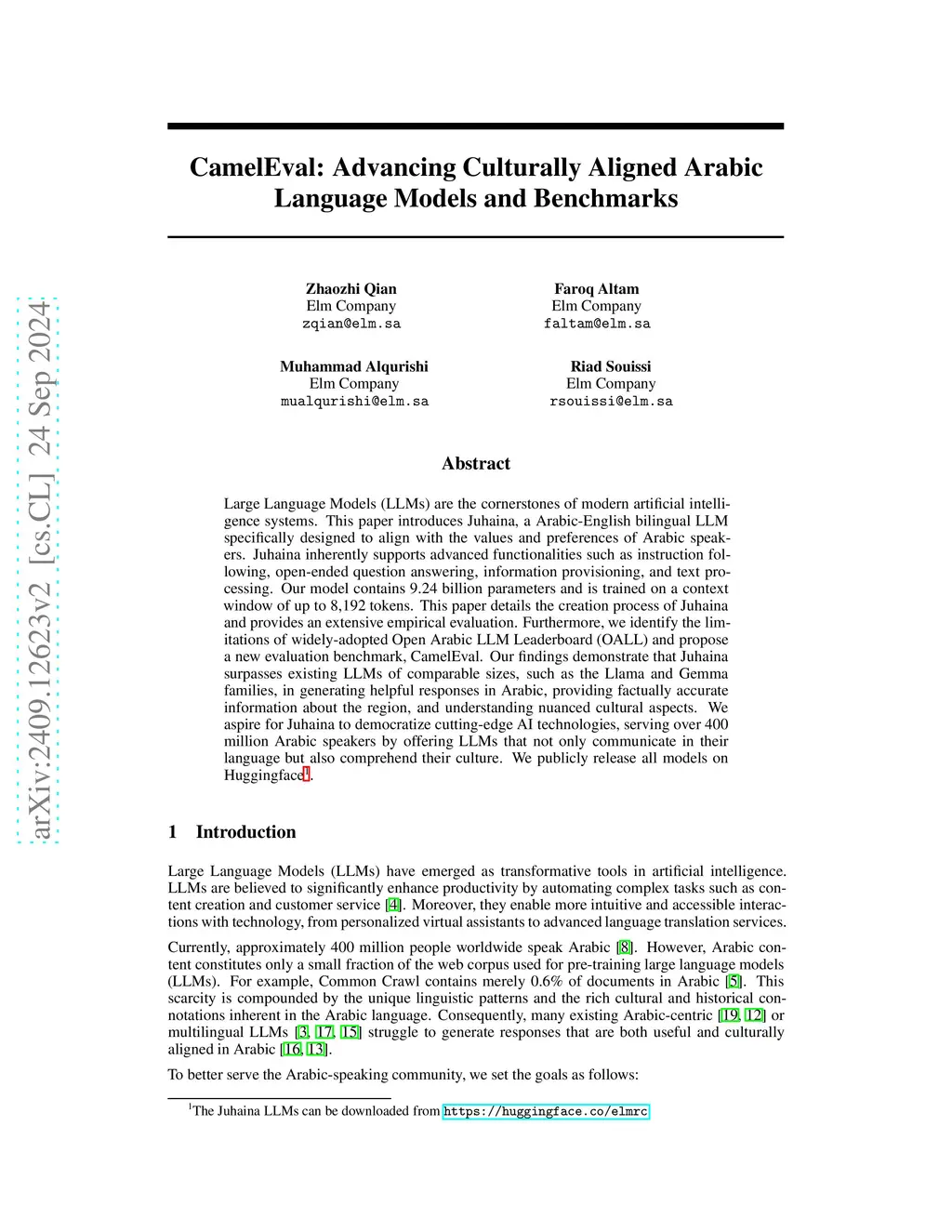 Large Language Models (LLMs) are the cornerstones of modern artificial intelligence systems. This paper introduces Juhaina, a Arabic-English bilingual LLM specifically designed to align with the values and preferences of Arabic speakers. Juhaina inherently supports advanced functionalities such as instruction following, open-ended question answering, information provisioning, and text processing. Our model contains 9.24 billion parameters and is trained on a context window of up to 8,192 tokens. This paper details the creation process of Juhaina and provides an extensive empirical evaluation. Furthermore, we identify the limitations of widely-adopted Open Arabic LLM Leaderboard (OALL) and propose a new evaluation benchmark, CamelEval. Our findings demonstrate that Juhaina surpasses existing LLMs of comparable sizes, such as the Llama and Gemma families, in generating helpful responses in Arabic, providing factually accurate information about the region, and understanding nuanced cultural aspects. We aspire for Juhaina to democratize cutting-edge AI technologies, serving over 400 million Arabic speakers by offering LLMs that not only communicate in their language but also comprehend their culture. We publicly release all models on Huggingface \url{https://huggingface.co/elmrc}.