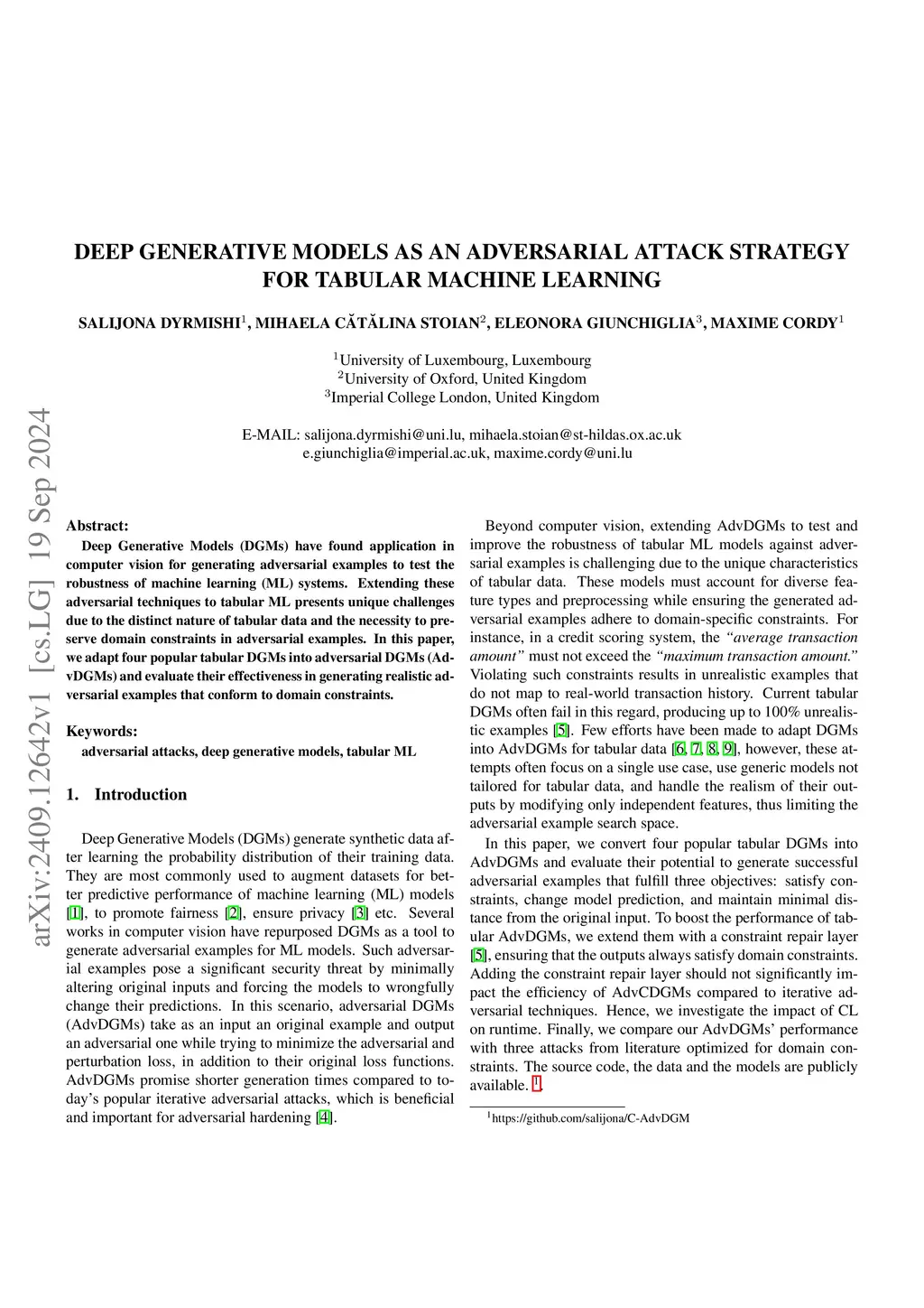 Deep Generative Models (DGMs) have found application in computer vision for generating adversarial examples to test the robustness of machine learning (ML) systems. Extending these adversarial techniques to tabular ML presents unique challenges due to the distinct nature of tabular data and the necessity to preserve domain constraints in adversarial examples. In this paper, we adapt four popular tabular DGMs into adversarial DGMs (AdvDGMs) and evaluate their effectiveness in generating realistic adversarial examples that conform to domain constraints.