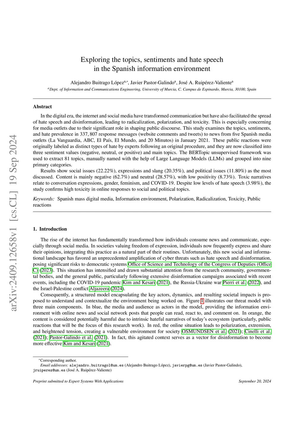 Exploring the topics, sentiments and hate speech in the Spanish
