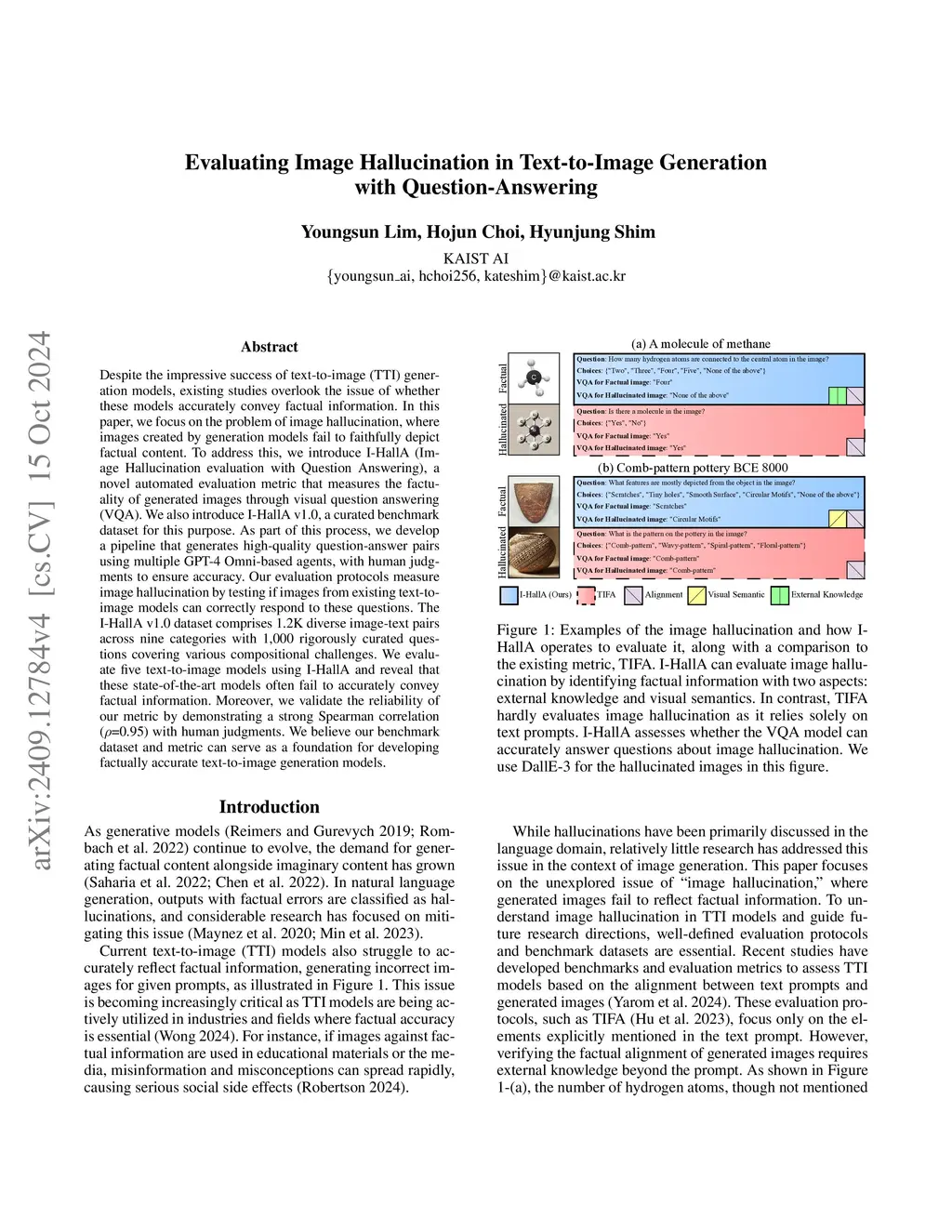 Despite the impressive success of text-to-image (TTI) generation models, existing studies overlook the issue of whether these models accurately convey factual information. In this paper, we focus on the problem of image hallucination, where images created by generation models fail to faithfully depict factual content. To address this, we introduce I-HallA (Image Hallucination evaluation with Question Answering), a novel automated evaluation metric that measures the factuality of generated images through visual question answering (VQA). We also introduce I-HallA v1.0, a curated benchmark dataset for this purpose. As part of this process, we develop a pipeline that generates high-quality question-answer pairs using multiple GPT-4 Omni-based agents, with human judgments to ensure accuracy. Our evaluation protocols measure image hallucination by testing if images from existing text-to-image models can correctly respond to these questions. The I-HallA v1.0 dataset comprises 1.2K diverse image-text pairs across nine categories with 1,000 rigorously curated questions covering various compositional challenges. We evaluate five text-to-image models using I-HallA and reveal that these state-of-the-art models often fail to accurately convey factual information. Moreover, we validate the reliability of our metric by demonstrating a strong Spearman correlation (rho=0.95) with human judgments. We believe our benchmark dataset and metric can serve as a foundation for developing factually accurate text-to-image generation models.