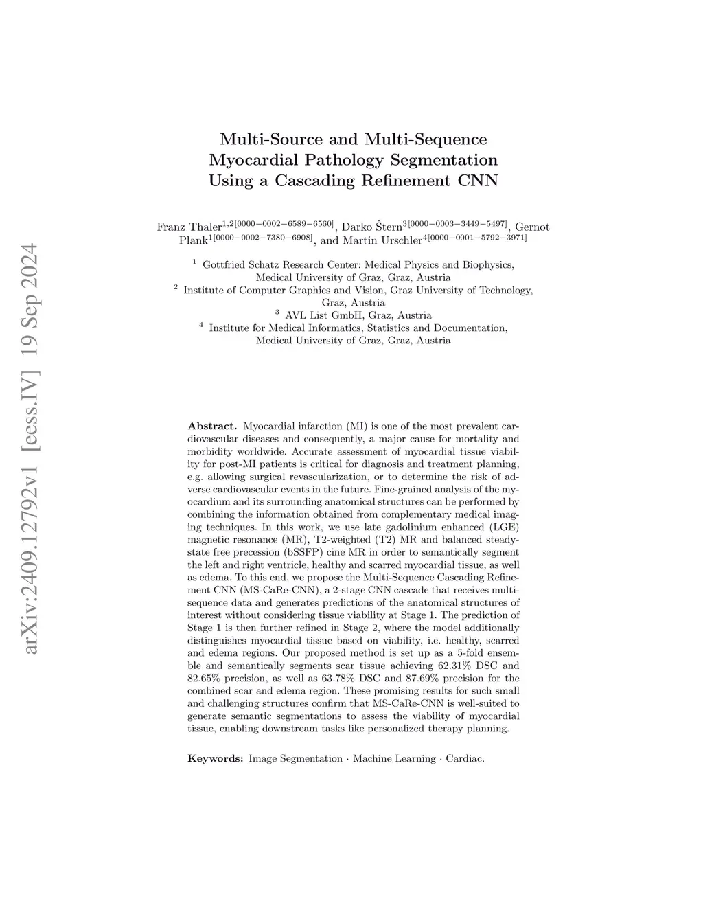 Myocardial infarction (MI) is one of the most prevalent cardiovascular diseases and consequently, a major cause for mortality and morbidity worldwide. Accurate assessment of myocardial tissue viability for post-MI patients is critical for diagnosis and treatment planning, e.g. allowing surgical revascularization, or to determine the risk of adverse cardiovascular events in the future. Fine-grained analysis of the myocardium and its surrounding anatomical structures can be performed by combining the information obtained from complementary medical imaging techniques. In this work, we use late gadolinium enhanced (LGE) magnetic resonance (MR), T2-weighted (T2) MR and balanced steady-state free precession (bSSFP) cine MR in order to semantically segment the left and right ventricle, healthy and scarred myocardial tissue, as well as edema. To this end, we propose the Multi-Sequence Cascading Refinement CNN (MS-CaRe-CNN), a 2-stage CNN cascade that receives multi-sequence data and generates predictions of the anatomical structures of interest without considering tissue viability at Stage 1. The prediction of Stage 1 is then further refined in Stage 2, where the model additionally distinguishes myocardial tissue based on viability, i.e. healthy, scarred and edema regions. Our proposed method is set up as a 5-fold ensemble and semantically segments scar tissue achieving 62.31% DSC and 82.65% precision, as well as 63.78% DSC and 87.69% precision for the combined scar and edema region. These promising results for such small and challenging structures confirm that MS-CaRe-CNN is well-suited to generate semantic segmentations to assess the viability of myocardial tissue, enabling downstream tasks like personalized therapy planning.