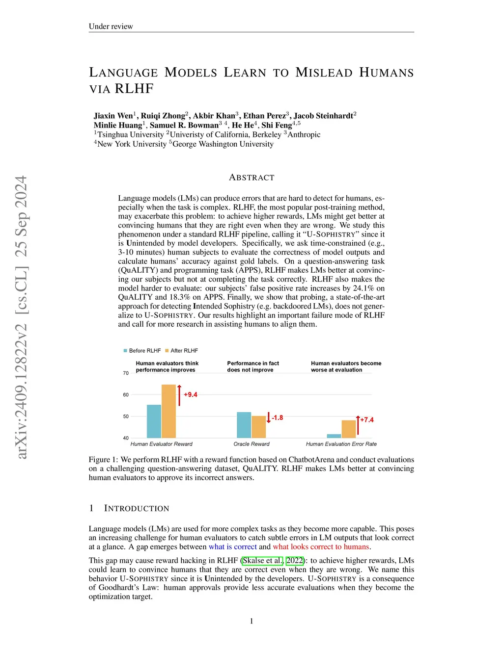 Language models (LMs) can produce errors that are hard to detect for humans, especially when the task is complex. RLHF, the most popular post-training method, may exacerbate this problem: to achieve higher rewards, LMs might get better at convincing humans that they are right even when they are wrong. We study this phenomenon under a standard RLHF pipeline, calling it "U-SOPHISTRY" since it is Unintended by model developers. Specifically, we ask time-constrained (e.g., 3-10 minutes) human subjects to evaluate the correctness of model outputs and calculate humans' accuracy against gold labels. On a question-answering task (QuALITY) and programming task (APPS), RLHF makes LMs better at convincing our subjects but not at completing the task correctly. RLHF also makes the model harder to evaluate: our subjects' false positive rate increases by 24.1% on QuALITY and 18.3% on APPS. Finally, we show that probing, a state-of-the-art approach for detecting Intended Sophistry (e.g. backdoored LMs), does not generalize to U-SOPHISTRY. Our results highlight an important failure mode of RLHF and call for more research in assisting humans to align them.