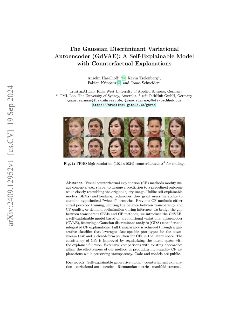 Visual counterfactual explanation (CF) methods modify image concepts, e.g, shape, to change a prediction to a predefined outcome while closely resembling the original query image. Unlike self-explainable models (SEMs) and heatmap techniques, they grant users the ability to examine hypothetical "what-if" scenarios. Previous CF methods either entail post-hoc training, limiting the balance between transparency and CF quality, or demand optimization during inference. To bridge the gap between transparent SEMs and CF methods, we introduce the GdVAE, a self-explainable model based on a conditional variational autoencoder (CVAE), featuring a Gaussian discriminant analysis (GDA) classifier and integrated CF explanations. Full transparency is achieved through a generative classifier that leverages class-specific prototypes for the downstream task and a closed-form solution for CFs in the latent space. The consistency of CFs is improved by regularizing the latent space with the explainer function. Extensive comparisons with existing approaches affirm the effectiveness of our method in producing high-quality CF explanations while preserving transparency. Code and models are public.