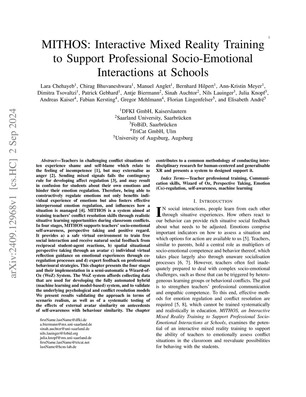 Teachers in challenging conflict situations often experience shame and self-blame, which relate to the feeling of incompetence but may externalise as anger. Sensing mixed signals fails the contingency rule for developing affect regulation and may result in confusion for students about their own emotions and hinder their emotion regulation. Therefore, being able to constructively regulate emotions not only benefits individual experience of emotions but also fosters effective interpersonal emotion regulation and influences how a situation is managed. MITHOS is a system aimed at training teachers' conflict resolution skills through realistic situative learning opportunities during classroom conflicts. In four stages, MITHOS supports teachers' socio-emotional self-awareness, perspective-taking and positive regard. It provides: a) a safe virtual environment to train free social interaction and receive natural social feedback from reciprocal student-agent reactions, b) spatial situational perspective taking through an avatar, c) individual virtual reflection guidance on emotional experiences through co-regulation processes, and d) expert feedback on professional behavioural strategies. This chapter presents the four stages and their implementation in a semi-automatic Wizard-of-Oz (WoZ) System. The WoZ system affords collecting data that are used for developing the fully automated hybrid (machine learning and model-based) system, and to validate the underlying psychological and conflict resolution models. We present results validating the approach in terms of scenario realism, as well as a systematic testing of the effects of external avatar similarity on antecedents of self-awareness with behavior similarity. The chapter contributes to a common methodology of conducting interdisciplinary research for human-centered and generalisable XR and presents a system designed to support it.