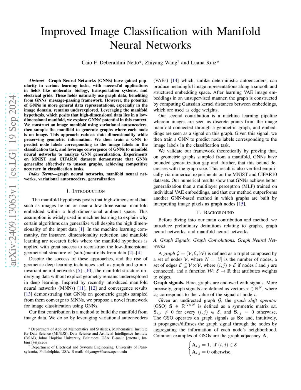Graph Neural Networks (GNNs) have gained popularity in various learning tasks, with successful applications in fields like molecular biology, transportation systems, and electrical grids. These fields naturally use graph data, benefiting from GNNs' message-passing framework. However, the potential of GNNs in more general data representations, especially in the image domain, remains underexplored. Leveraging the manifold hypothesis, which posits that high-dimensional data lies in a low-dimensional manifold, we explore GNNs' potential in this context. We construct an image manifold using variational autoencoders, then sample the manifold to generate graphs where each node is an image. This approach reduces data dimensionality while preserving geometric information. We then train a GNN to predict node labels corresponding to the image labels in the classification task, and leverage convergence of GNNs to manifold neural networks to analyze GNN generalization. Experiments on MNIST and CIFAR10 datasets demonstrate that GNNs generalize effectively to unseen graphs, achieving competitive accuracy in classification tasks.