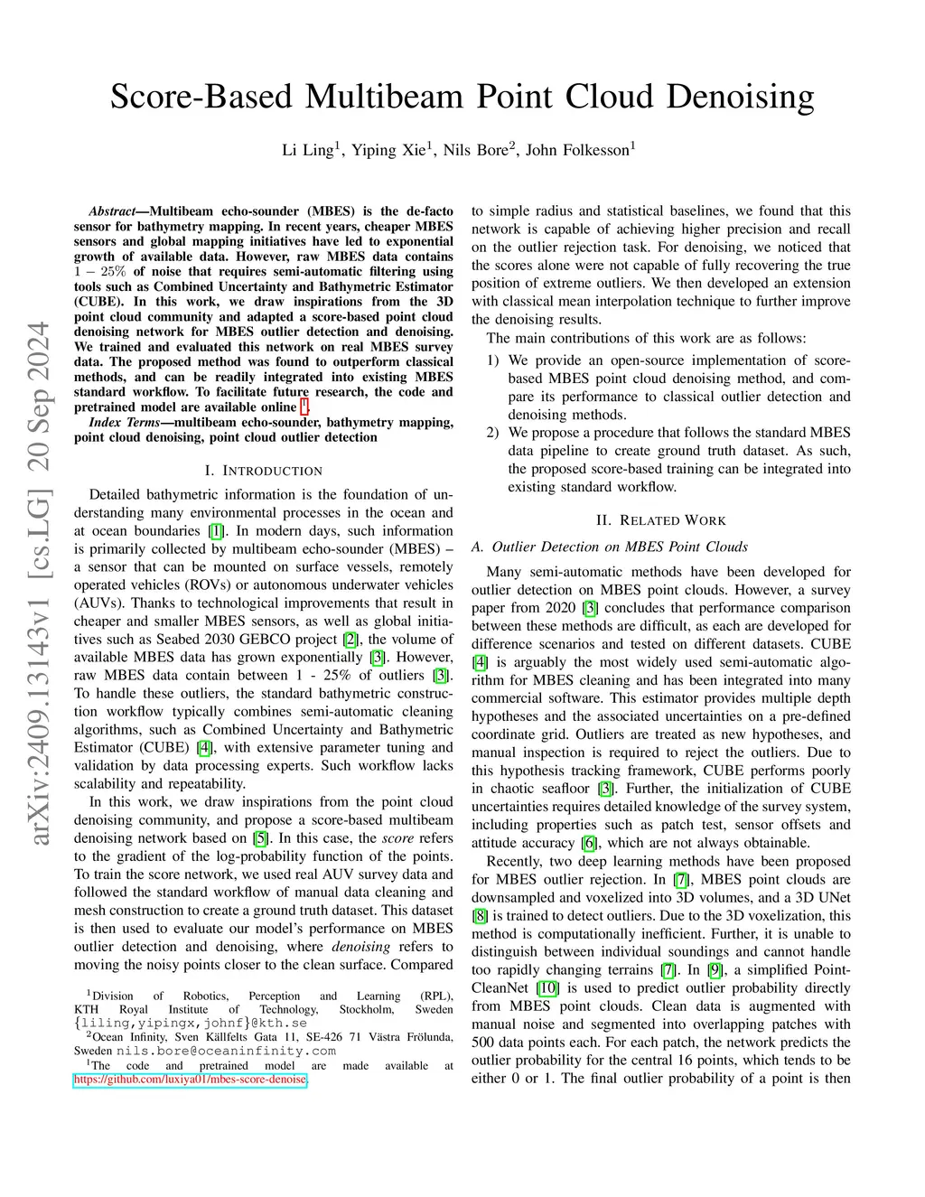 Multibeam echo-sounder (MBES) is the de-facto sensor for bathymetry mapping. In recent years, cheaper MBES sensors and global mapping initiatives have led to exponential growth of available data. However, raw MBES data contains 1-25% of noise that requires semi-automatic filtering using tools such as Combined Uncertainty and Bathymetric Estimator (CUBE). In this work, we draw inspirations from the 3D point cloud community and adapted a score-based point cloud denoising network for MBES outlier detection and denoising. We trained and evaluated this network on real MBES survey data. The proposed method was found to outperform classical methods, and can be readily integrated into existing MBES standard workflow. To facilitate future research, the code and pretrained model are available online.