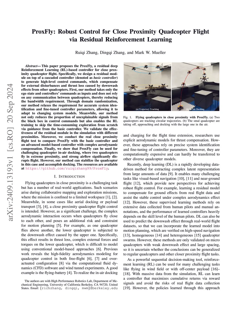 This paper proposes the ProxFly, a residual deep Reinforcement Learning (RL)-based controller for close proximity quadcopter flight. Specifically, we design a residual module on top of a cascaded controller (denoted as basic controller) to generate high-level control commands, which compensate for external disturbances and thrust loss caused by downwash effects from other quadcopters. First, our method takes only the ego state and controllers' commands as inputs and does not rely on any communication between quadcopters, thereby reducing the bandwidth requirement. Through domain randomization, our method relaxes the requirement for accurate system identification and fine-tuned controller parameters, allowing it to adapt to changing system models. Meanwhile, our method not only reduces the proportion of unexplainable signals from the black box in control commands but also enables the RL training to skip the time-consuming exploration from scratch via guidance from the basic controller. We validate the effectiveness of the residual module in the simulation with different proximities. Moreover, we conduct the real close proximity flight test to compare ProxFly with the basic controller and an advanced model-based controller with complex aerodynamic compensation. Finally, we show that ProxFly can be used for challenging quadcopter mid-air docking, where two quadcopters fly in extreme proximity, and strong airflow significantly disrupts flight. However, our method can stabilize the quadcopter in this case and accomplish docking. The resources are available atthis https URL.