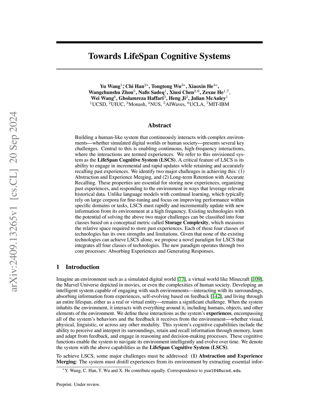 Building a human-like system that continuously interacts with complex environments -- whether simulated digital worlds or human society -- presents several key challenges. Central to this is enabling continuous, high-frequency interactions, where the interactions are termed experiences. We refer to this envisioned system as the LifeSpan Cognitive System (LSCS). A critical feature of LSCS is its ability to engage in incremental and rapid updates while retaining and accurately recalling past experiences. In this paper we focus on the domain of Large Language Models (LLMs), where we identify two major challenges: (1) Abstraction and Experience Merging, and (2) Long-term Retention with Accurate Recall. These properties are essential for storing new experiences, organizing past experiences, and responding to the environment in ways that leverage relevant historical data. Unlike language models with continual learning, which typically rely on large corpora for fine-tuning and focus on improving performance within specific domains or tasks, LSCS must rapidly and incrementally update with new information from its environment at a high frequency. Existing technologies with the potential of solving the above two major challenges can be classified into four classes based on a conceptual metric called Storage Complexity, which measures the relative space required to store past experiences. Each of these four classes of technologies has its own strengths and limitations while we argue none of them alone can achieve LSCS alone. To this end, we propose a potential instantiation for LSCS that can integrate all four classes of technologies. The new instantiation, serving as a conjecture, operates through two core processes: Absorbing Experiences and Generating Responses.