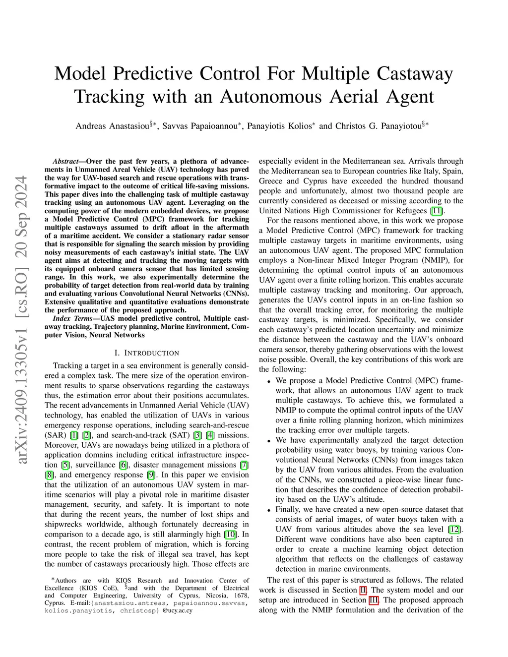 Over the past few years, a plethora of advancements in Unmanned Areal Vehicle (UAV) technology has paved the way for UAV-based search and rescue operations with transformative impact to the outcome of critical life-saving missions. This paper dives into the challenging task of multiple castaway tracking using an autonomous UAV agent. Leveraging on the computing power of the modern embedded devices, we propose a Model Predictive Control (MPC) framework for tracking multiple castaways assumed to drift afloat in the aftermath of a maritime accident. We consider a stationary radar sensor that is responsible for signaling the search mission by providing noisy measurements of each castaway's initial state. The UAV agent aims at detecting and tracking the moving targets with its equipped onboard camera sensor that has limited sensing range. In this work, we also experimentally determine the probability of target detection from real-world data by training and evaluating various Convolutional Neural Networks (CNNs). Extensive qualitative and quantitative evaluations demonstrate the performance of the proposed approach.