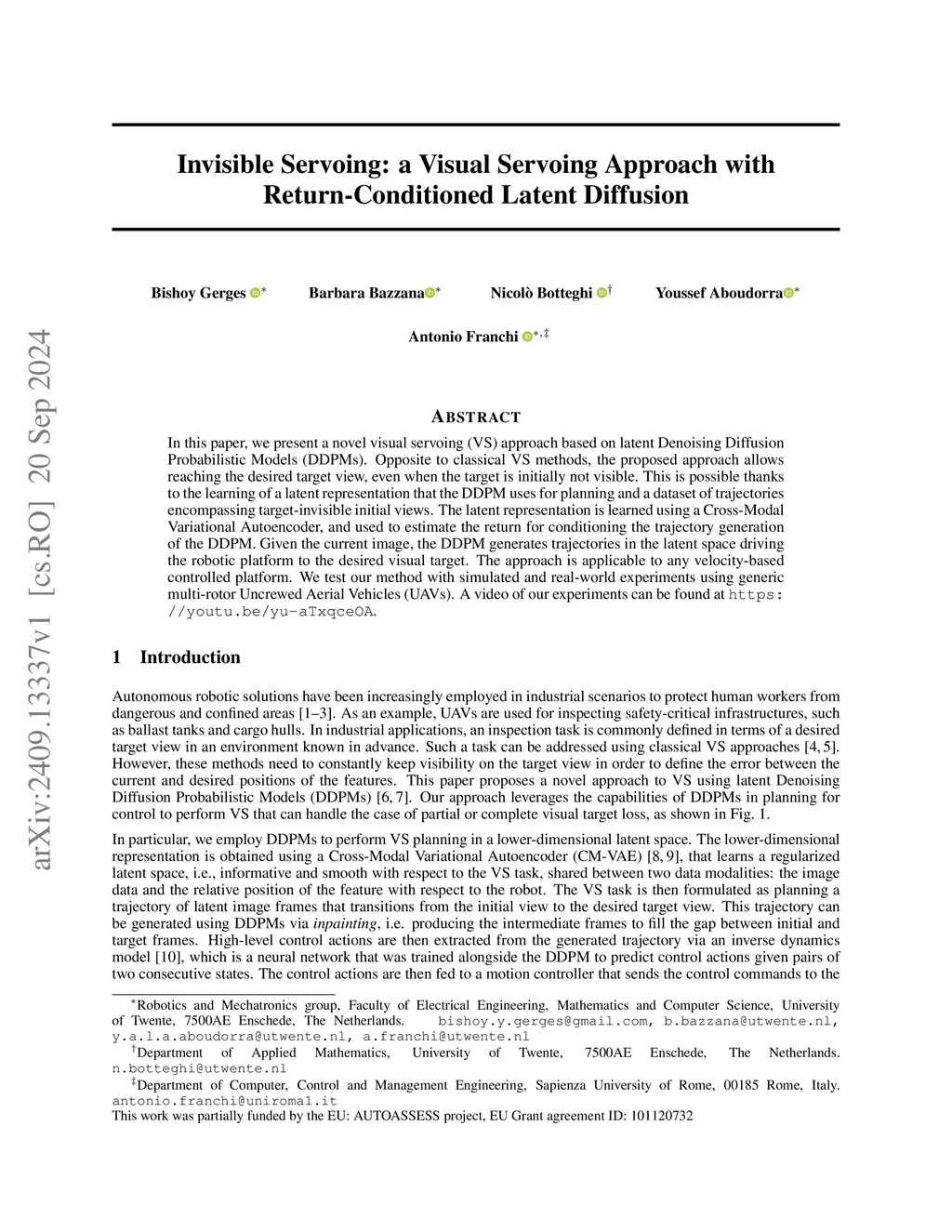 In this paper, we present a novel visual servoing (VS) approach based on latent Denoising Diffusion Probabilistic Models (DDPMs), that explores the application of generative models for vision-based navigation of UAVs (Uncrewed Aerial Vehicles). Opposite to classical VS methods, the proposed approach allows reaching the desired target view, even when the target is initially not visible. This is possible thanks to the learning of a latent representation that the DDPM uses for planning and a dataset of trajectories encompassing target-invisible initial views. A compact representation is learned from raw images using a Cross-Modal Variational Autoencoder. Given the current image, the DDPM generates trajectories in the latent space driving the robotic platform to the desired visual target. The approach has been validated in simulation using two generic multi-rotor UAVs (a quadrotor and a hexarotor). The results show that we can successfully reach the visual target, even if not visible in the initial view.