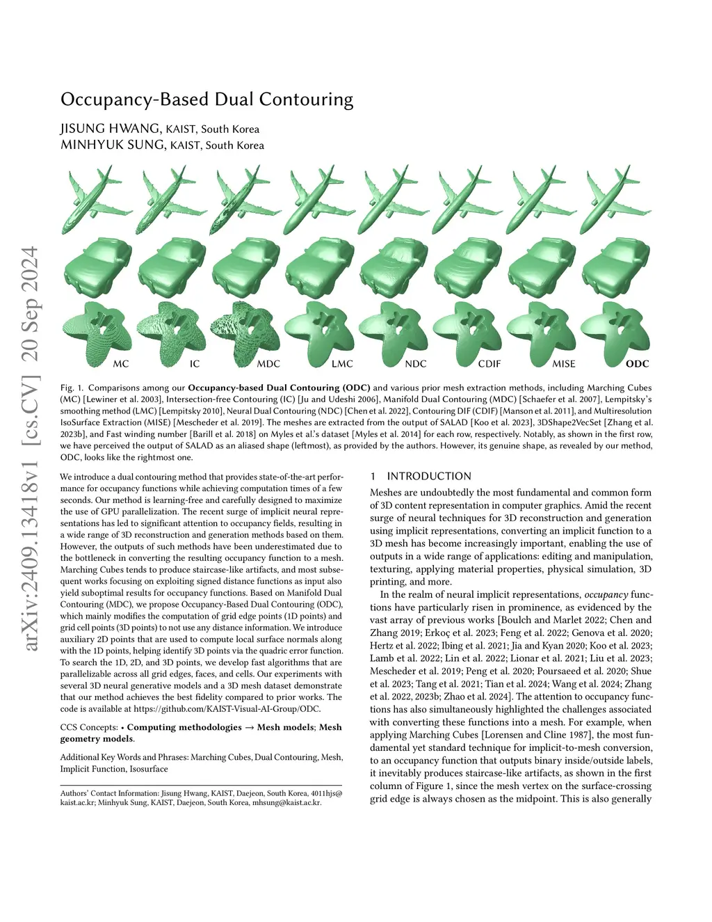 We introduce a dual contouring method that provides state-of-the-art performance for occupancy functions while achieving computation times of a few seconds. Our method is learning-free and carefully designed to maximize the use of GPU parallelization. The recent surge of implicit neural representations has led to significant attention to occupancy fields, resulting in a wide range of 3D reconstruction and generation methods based on them. However, the outputs of such methods have been underestimated due to the bottleneck in converting the resulting occupancy function to a mesh. Marching Cubes tends to produce staircase-like artifacts, and most subsequent works focusing on exploiting signed distance functions as input also yield suboptimal results for occupancy functions. Based on Manifold Dual Contouring (MDC), we propose Occupancy-Based Dual Contouring (ODC), which mainly modifies the computation of grid edge points (1D points) and grid cell points (3D points) to not use any distance information. We introduce auxiliary 2D points that are used to compute local surface normals along with the 1D points, helping identify 3D points via the quadric error function. To search the 1D, 2D, and 3D points, we develop fast algorithms that are parallelizable across all grid edges, faces, and cells. Our experiments with several 3D neural generative models and a 3D mesh dataset demonstrate that our method achieves the best fidelity compared to prior works.
