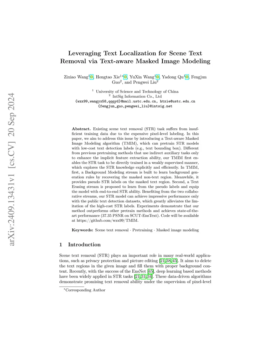 Existing scene text removal (STR) task suffers from insufficient training data due to the expensive pixel-level labeling. In this paper, we aim to address this issue by introducing a Text-aware Masked Image Modeling algorithm (TMIM), which can pretrain STR models with low-cost text detection labels (e.g., text bounding box). Different from previous pretraining methods that use indirect auxiliary tasks only to enhance the implicit feature extraction ability, our TMIM first enables the STR task to be directly trained in a weakly supervised manner, which explores the STR knowledge explicitly and efficiently. In TMIM, first, a Background Modeling stream is built to learn background generation rules by recovering the masked non-text region. Meanwhile, it provides pseudo STR labels on the masked text region. Second, a Text Erasing stream is proposed to learn from the pseudo labels and equip the model with end-to-end STR ability. Benefiting from the two collaborative streams, our STR model can achieve impressive performance only with the public text detection datasets, which greatly alleviates the limitation of the high-cost STR labels. Experiments demonstrate that our method outperforms other pretrain methods and achieves state-of-the-art performance (37.35 PSNR on SCUT-EnsText). Code will be available at https://github.com/wzx99/TMIM.