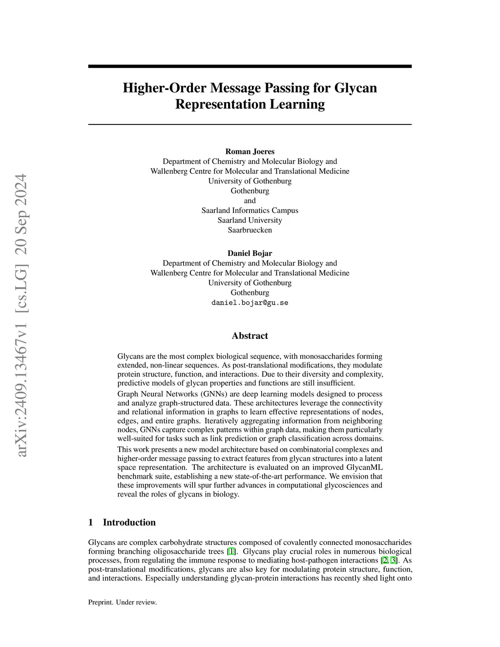 Glycans are the most complex biological sequence, with monosaccharides forming extended, non-linear sequences. As post-translational modifications, they modulate protein structure, function, and interactions. Due to their diversity and complexity, predictive models of glycan properties and functions are still insufficient.Graph Neural Networks (GNNs) are deep learning models designed to process and analyze graph-structured data. These architectures leverage the connectivity and relational information in graphs to learn effective representations of nodes, edges, and entire graphs. Iteratively aggregating information from neighboring nodes, GNNs capture complex patterns within graph data, making them particularly well-suited for tasks such as link prediction or graph classification across domains.This work presents a new model architecture based on combinatorial complexes and higher-order message passing to extract features from glycan structures into a latent space representation. The architecture is evaluated on an improved GlycanML benchmark suite, establishing a new state-of-the-art performance. We envision that these improvements will spur further advances in computational glycosciences and reveal the roles of glycans in biology.