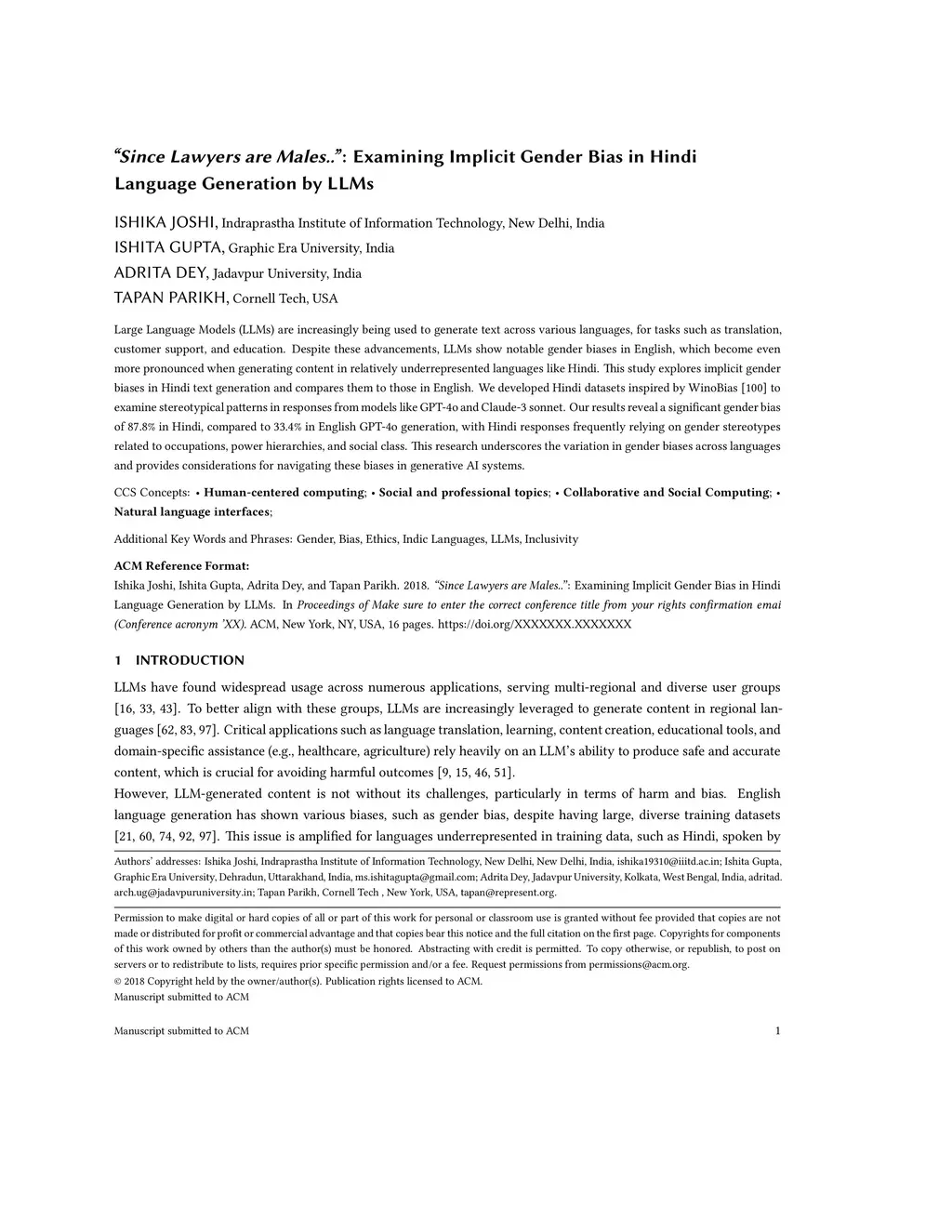 'Since Lawyers are Males..': Examining Implicit Gender Bias in Hindi