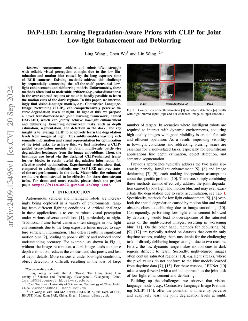 Autonomous vehicles and robots often struggle with reliable visual perception at night due to the low illumination and motion blur caused by the long exposure time of RGB cameras. Existing methods address this challenge by sequentially connecting the off-the-shelf pretrained low-light enhancement and deblurring models. Unfortunately, these methods often lead to noticeable artifacts (\eg, color distortions) in the over-exposed regions or make it hardly possible to learn the motion cues of the dark regions. In this paper, we interestingly find vision-language models, \eg, Contrastive Language-Image Pretraining (CLIP), can comprehensively perceive diverse degradation levels at night. In light of this, we propose a novel transformer-based joint learning framework, named DAP-LED, which can jointly achieve low-light enhancement and deblurring, benefiting downstream tasks, such as depth estimation, segmentation, and detection in the dark. The key insight is to leverage CLIP to adaptively learn the degradation levels from images at night. This subtly enables learning rich semantic information and visual representation for optimization of the joint tasks. To achieve this, we first introduce a CLIP-guided cross-fusion module to obtain multi-scale patch-wise degradation heatmaps from the image embeddings. Then, the heatmaps are fused via the designed CLIP-enhanced transformer blocks to retain useful degradation information for effective model optimization. Experimental results show that, compared to existing methods, our DAP-LED achieves state-of-the-art performance in the dark. Meanwhile, the enhanced results are demonstrated to be effective for three downstream tasks. For demo and more results, please check the project page: \url{https://vlislab22.github.io/dap-led/}.