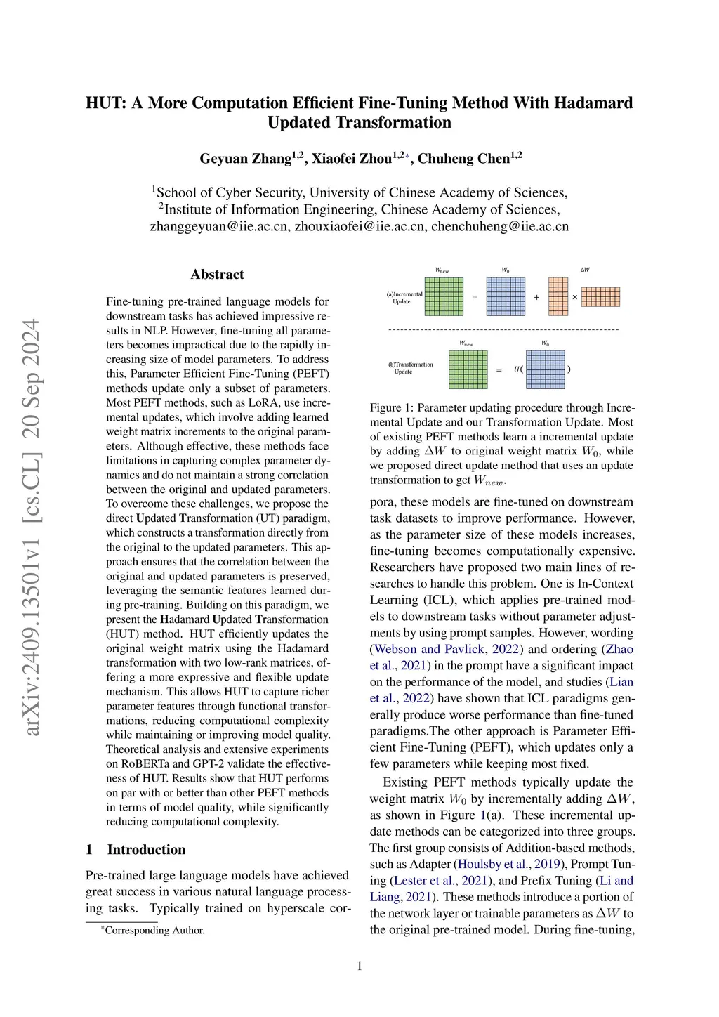 Fine-tuning pre-trained language models for downstream tasks has achieved impressive results in NLP. However, fine-tuning all parameters becomes impractical due to the rapidly increasing size of model parameters. To address this, Parameter Efficient Fine-Tuning (PEFT) methods update only a subset of parameters. Most PEFT methods, such as LoRA, use incremental updates, which involve adding learned weight matrix increments to the original parameters. Although effective, these methods face limitations in capturing complex parameter dynamics and do not maintain a strong correlation between the original and updated parameters. To overcome these challenges, we propose the direct Updated Transformation (UT) paradigm, which constructs a transformation directly from the original to the updated parameters. This approach ensures that the correlation between the original and updated parameters is preserved, leveraging the semantic features learned during pre-training. Building on this paradigm, we present the Hadamard Updated Transformation (HUT) method. HUT efficiently updates the original weight matrix using the Hadamard transformation with two low-rank matrices, offering a more expressive and flexible update mechanism. This allows HUT to capture richer parameter features through functional transformations, reducing computational complexity while maintaining or improving model quality. Theoretical analysis and extensive experiments on RoBERTa and GPT-2 validate the effectiveness of HUT. Results show that HUT performs on par with or better than other PEFT methods in terms of model quality, while significantly reducing computational complexity.