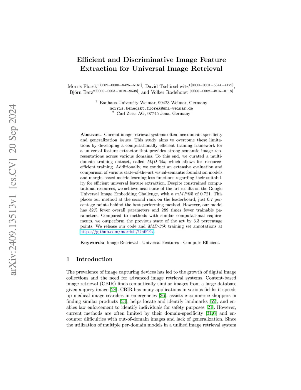 Current image retrieval systems often face domain specificity and generalization issues. This study aims to overcome these limitations by developing a computationally efficient training framework for a universal feature extractor that provides strong semantic image representations across various domains. To this end, we curated a multi-domain training dataset, called M4D-35k, which allows for resource-efficient training. Additionally, we conduct an extensive evaluation and comparison of various state-of-the-art visual-semantic foundation models and margin-based metric learning loss functions regarding their suitability for efficient universal feature extraction. Despite constrained computational resources, we achieve near state-of-the-art results on the Google Universal Image Embedding Challenge, with a mMP@5 of 0.721. This places our method at the second rank on the leaderboard, just 0.7 percentage points behind the best performing method. However, our model has 32% fewer overall parameters and 289 times fewer trainable parameters. Compared to methods with similar computational requirements, we outperform the previous state of the art by 3.3 percentage points. We release our code and M4D-35k training set annotations at https://github.com/morrisfl/UniFEx.