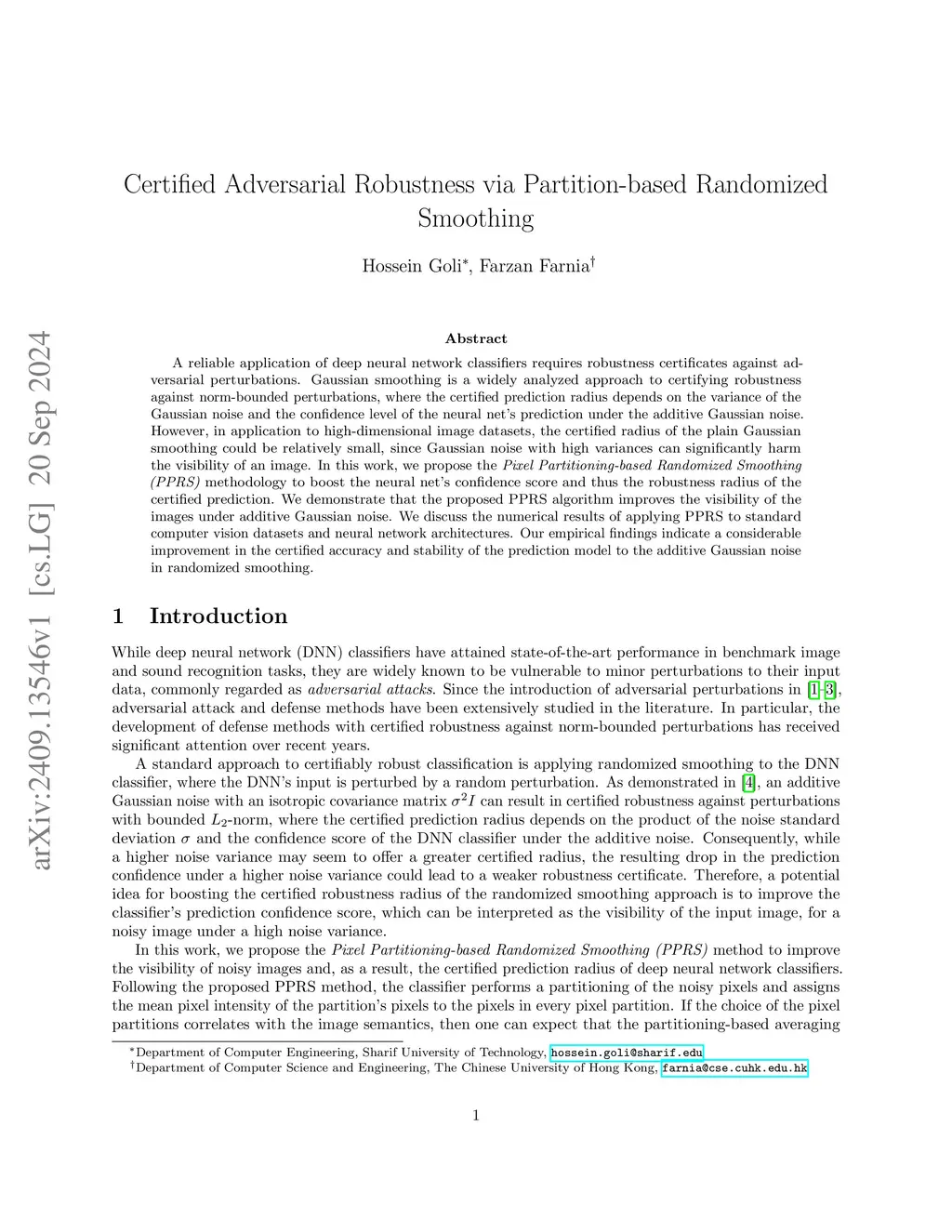 A reliable application of deep neural network classifiers requires robustness certificates against adversarial perturbations. Gaussian smoothing is a widely analyzed approach to certifying robustness against norm-bounded perturbations, where the certified prediction radius depends on the variance of the Gaussian noise and the confidence level of the neural net's prediction under the additive Gaussian noise. However, in application to high-dimensional image datasets, the certified radius of the plain Gaussian smoothing could be relatively small, since Gaussian noise with high variances can significantly harm the visibility of an image. In this work, we propose the Pixel Partitioning-based Randomized Smoothing (PPRS) methodology to boost the neural net's confidence score and thus the robustness radius of the certified prediction. We demonstrate that the proposed PPRS algorithm improves the visibility of the images under additive Gaussian noise. We discuss the numerical results of applying PPRS to standard computer vision datasets and neural network architectures. Our empirical findings indicate a considerable improvement in the certified accuracy and stability of the prediction model to the additive Gaussian noise in randomized smoothing.