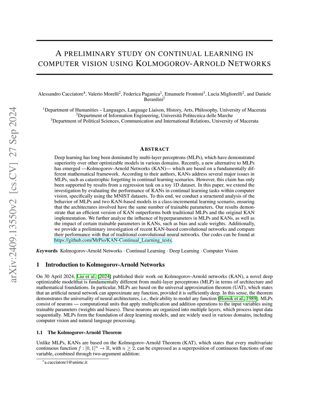 Deep learning has long been dominated by multi-layer perceptrons (MLPs), which have demonstrated superiority over other optimizable models in various domains. Recently, a new alternative to MLPs has emerged - Kolmogorov-Arnold Networks (KAN)- which are based on a fundamentally different mathematical framework. According to their authors, KANs address several major issues in MLPs, such as catastrophic forgetting in continual learning scenarios. However, this claim has only been supported by results from a regression task on a toy 1D dataset. In this paper, we extend the investigation by evaluating the performance of KANs in continual learning tasks within computer vision, specifically using the MNIST datasets. To this end, we conduct a structured analysis of the behavior of MLPs and two KAN-based models in a class-incremental learning scenario, ensuring that the architectures involved have the same number of trainable parameters. Our results demonstrate that an efficient version of KAN outperforms both traditional MLPs and the original KAN implementation. We further analyze the influence of hyperparameters in MLPs and KANs, as well as the impact of certain trainable parameters in KANs, such as bias and scale weights. Additionally, we provide a preliminary investigation of recent KAN-based convolutional networks and compare their performance with that of traditional convolutional neural networks. Our codes can be found at https://github.com/MrPio/KAN-Continual_Learning_tests.