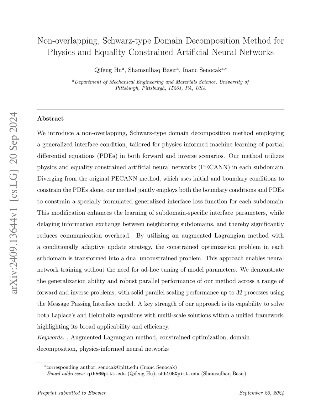We introduce a non-overlapping, Schwarz-type domain decomposition method employing a generalized interface condition, tailored for physics-informed machine learning of partial differential equations (PDEs) in both forward and inverse scenarios. Our method utilizes physics and equality constrained artificial neural networks (PECANN) in each subdomain. Diverging from the original PECANN method, which uses initial and boundary conditions to constrain the PDEs alone, our method jointly employs both the boundary conditions and PDEs to constrain a specially formulated generalized interface loss function for each subdomain. This modification enhances the learning of subdomain-specific interface parameters, while delaying information exchange between neighboring subdomains, and thereby significantly reduces communication overhead. By utilizing an augmented Lagrangian method with a conditionally adaptive update strategy, the constrained optimization problem in each subdomain is transformed into a dual unconstrained problem. This approach enables neural network training without the need for ad-hoc tuning of model parameters. We demonstrate the generalization ability and robust parallel performance of our method across a range of forward and inverse problems, with solid parallel scaling performance up to 32 processes using the Message Passing Interface model. A key strength of our approach is its capability to solve both Laplace's and Helmholtz equations with multi-scale solutions within a unified framework, highlighting its broad applicability and efficiency.