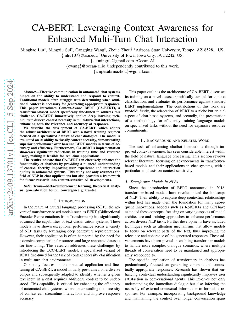 Effective communication in automated chat systems hinges on the ability to understand and respond to context. Traditional models often struggle with determining when additional context is necessary for generating appropriate responses. This paper introduces Context-Aware BERT (CA-BERT), a transformer-based model specifically fine-tuned to address this challenge. CA-BERT innovatively applies deep learning techniques to discern context necessity in multi-turn chat interactions, enhancing both the relevance and accuracy of responses. We describe the development of CA-BERT, which adapts the robust architecture of BERT with a novel training regimen focused on a specialized dataset of chat dialogues. The model is evaluated on its ability to classify context necessity, demonstrating superior performance over baseline BERT models in terms of accuracy and efficiency. Furthermore, CA-BERT's implementation showcases significant reductions in training time and resource usage, making it feasible for real-time applications. The results indicate that CA-BERT can effectively enhance the functionality of chatbots by providing a nuanced understanding of context, thereby improving user experience and interaction quality in automated systems. This study not only advances the field of NLP in chat applications but also provides a framework for future research into context-sensitive AI developments.