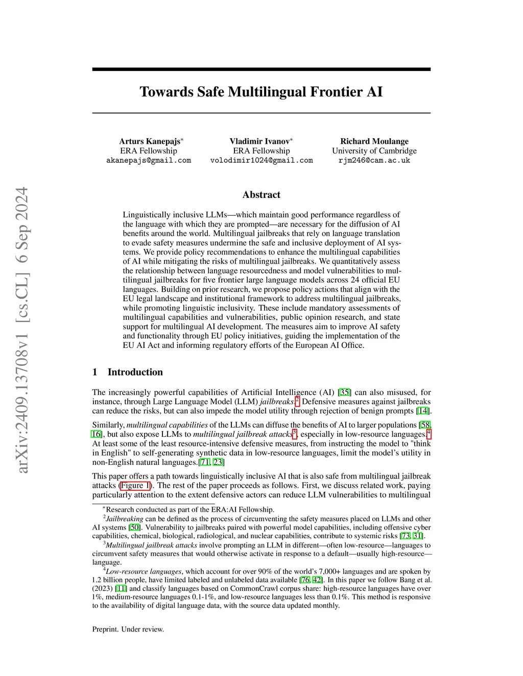Linguistically inclusive LLMs -- which maintain good performance regardless of the language with which they are prompted -- are necessary for the diffusion of AI benefits around the world. Multilingual jailbreaks that rely on language translation to evade safety measures undermine the safe and inclusive deployment of AI systems. We provide policy recommendations to enhance the multilingual capabilities of AI while mitigating the risks of multilingual jailbreaks. We examine how a language's level of resourcing relates to how vulnerable LLMs are to multilingual jailbreaks in that language. We do this by testing five advanced AI models across 24 official languages of the EU. Building on prior research, we propose policy actions that align with the EU legal landscape and institutional framework to address multilingual jailbreaks, while promoting linguistic inclusivity. These include mandatory assessments of multilingual capabilities and vulnerabilities, public opinion research, and state support for multilingual AI development. The measures aim to improve AI safety and functionality through EU policy initiatives, guiding the implementation of the EU AI Act and informing regulatory efforts of the European AI Office.