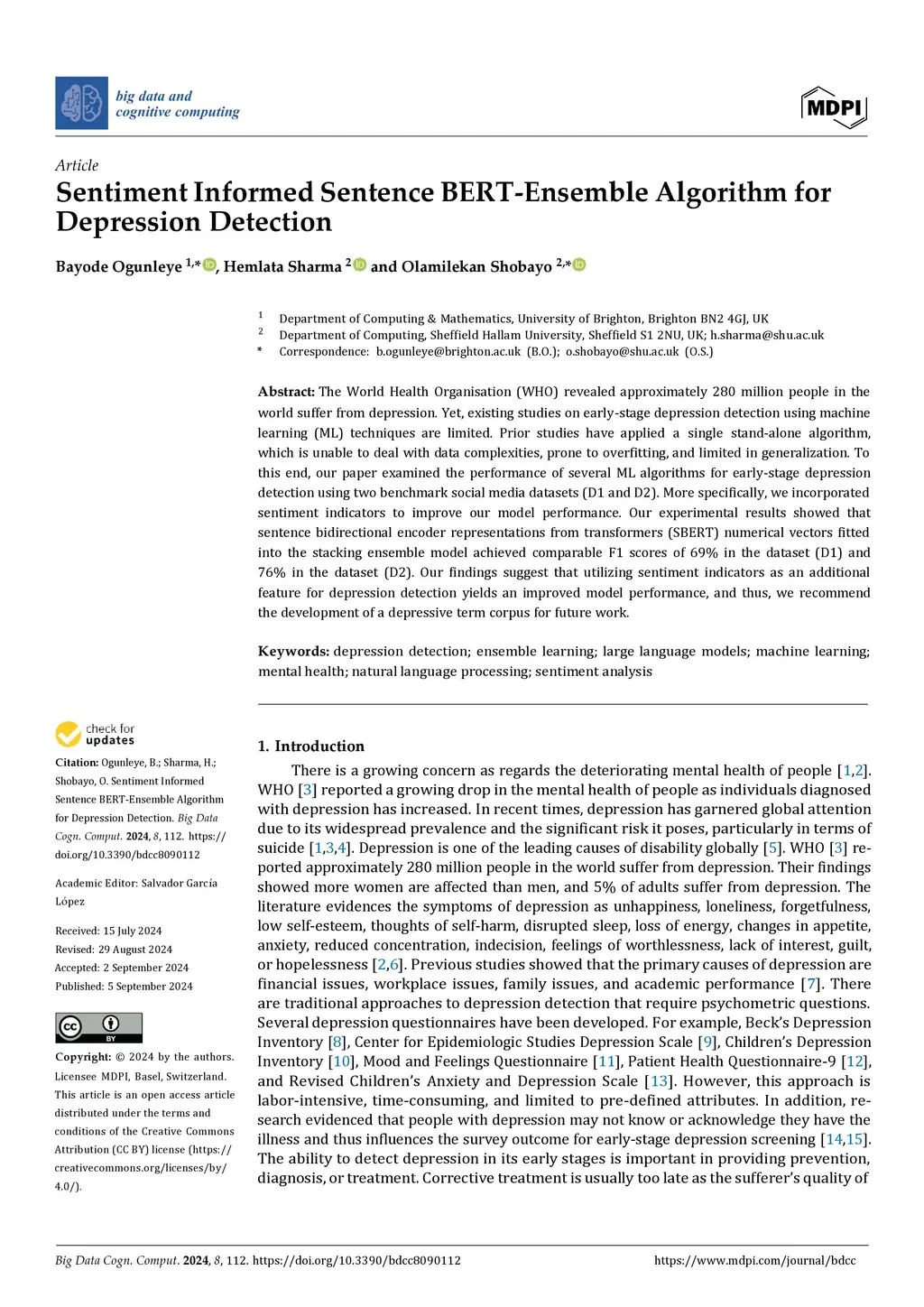 Sentiment Informed Sentence BERT-Ensemble Algorithm for Depression