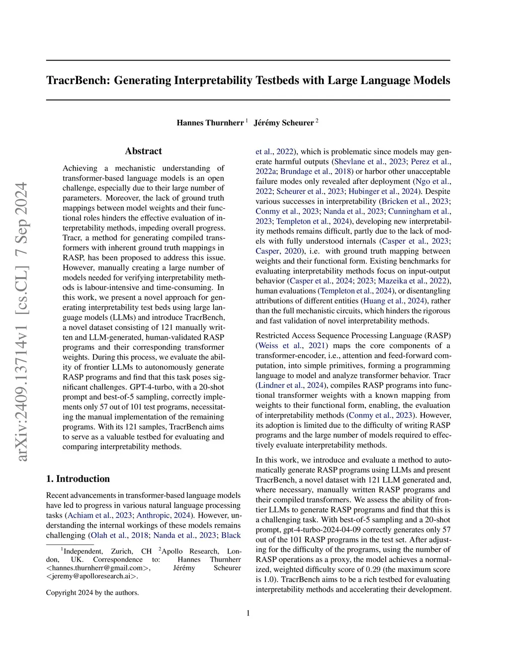 Achieving a mechanistic understanding of transformer-based language models is an open challenge, especially due to their large number of parameters. Moreover, the lack of ground truth mappings between model weights and their functional roles hinders the effective evaluation of interpretability methods, impeding overall progress. Tracr, a method for generating compiled transformers with inherent ground truth mappings in RASP, has been proposed to address this issue. However, manually creating a large number of models needed for verifying interpretability methods is labour-intensive and time-consuming. In this work, we present a novel approach for generating interpretability test beds using large language models (LLMs) and introduce TracrBench, a novel dataset consisting of 121 manually written and LLM-generated, human-validated RASP programs and their corresponding transformer weights. During this process, we evaluate the ability of frontier LLMs to autonomously generate RASP programs and find that this task poses significant challenges. GPT-4-turbo, with a 20-shot prompt and best-of-5 sampling, correctly implements only 57 out of 101 test programs, necessitating the manual implementation of the remaining programs. With its 121 samples, TracrBench aims to serve as a valuable testbed for evaluating and comparing interpretability methods.