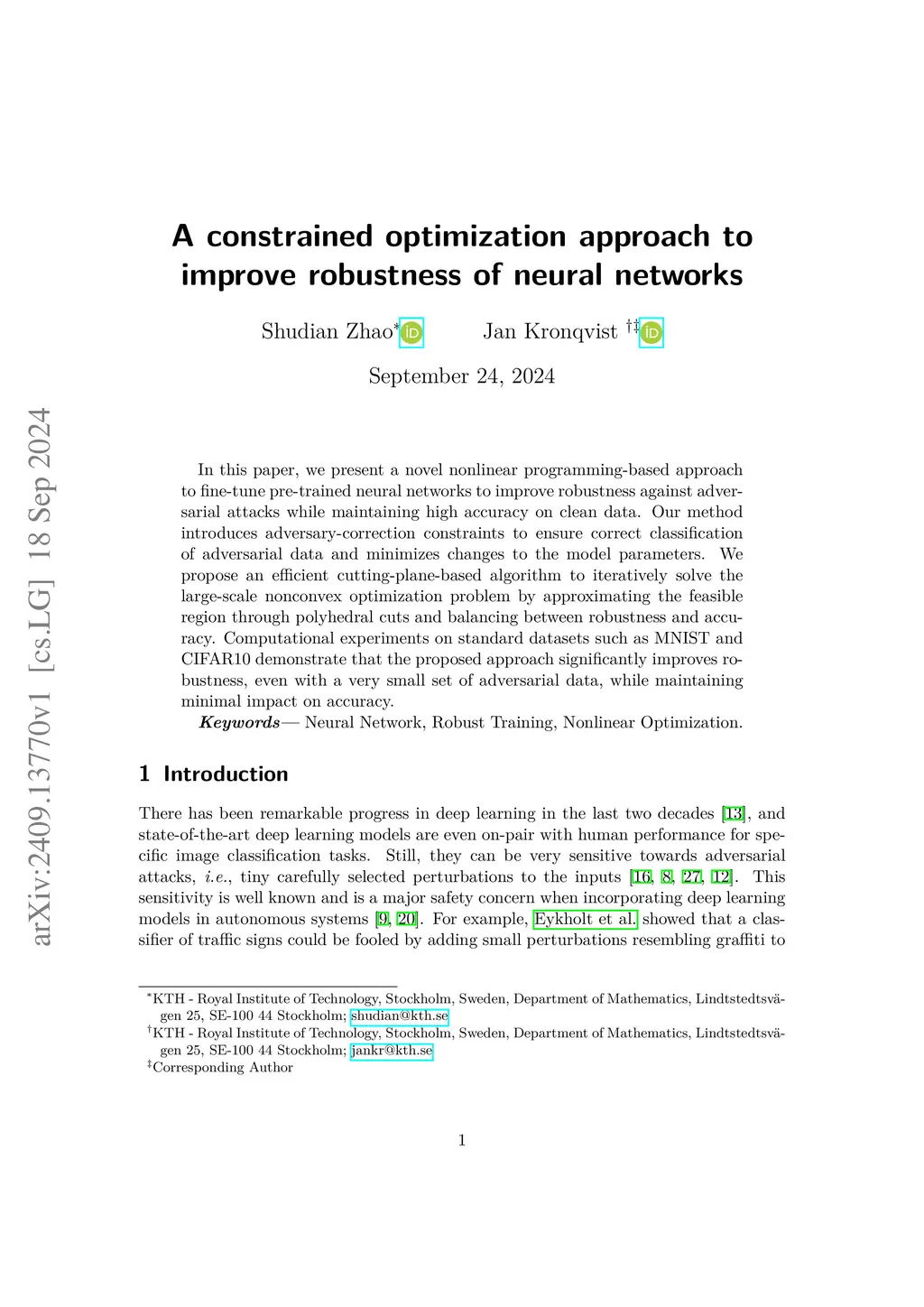 In this paper, we present a novel nonlinear programming-based approach to fine-tune pre-trained neural networks to improve robustness against adversarial attacks while maintaining high accuracy on clean data. Our method introduces adversary-correction constraints to ensure correct classification of adversarial data and minimizes changes to the model parameters. We propose an efficient cutting-plane-based algorithm to iteratively solve the large-scale nonconvex optimization problem by approximating the feasible region through polyhedral cuts and balancing between robustness and accuracy. Computational experiments on standard datasets such as MNIST and CIFAR10 demonstrate that the proposed approach significantly improves robustness, even with a very small set of adversarial data, while maintaining minimal impact on accuracy.
