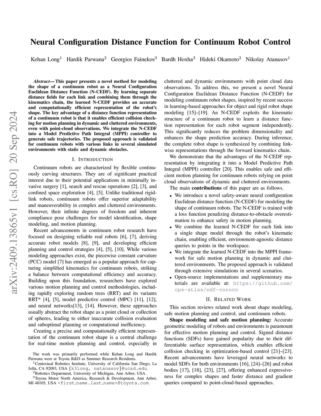 This paper presents a novel method for modeling the shape of a continuum robot as a Neural Configuration Euclidean Distance Function (N-CEDF). By learning separate distance fields for each link and combining them through the kinematics chain, the learned N-CEDF provides an accurate and computationally efficient representation of the robot's shape. The key advantage of a distance function representation of a continuum robot is that it enables efficient collision checking for motion planning in dynamic and cluttered environments, even with point-cloud observations. We integrate the N-CEDF into a Model Predictive Path Integral (MPPI) controller to generate safe trajectories for multi-segment continuum robots. The proposed approach is validated for continuum robots with various links in several simulated environments with static and dynamic obstacles.