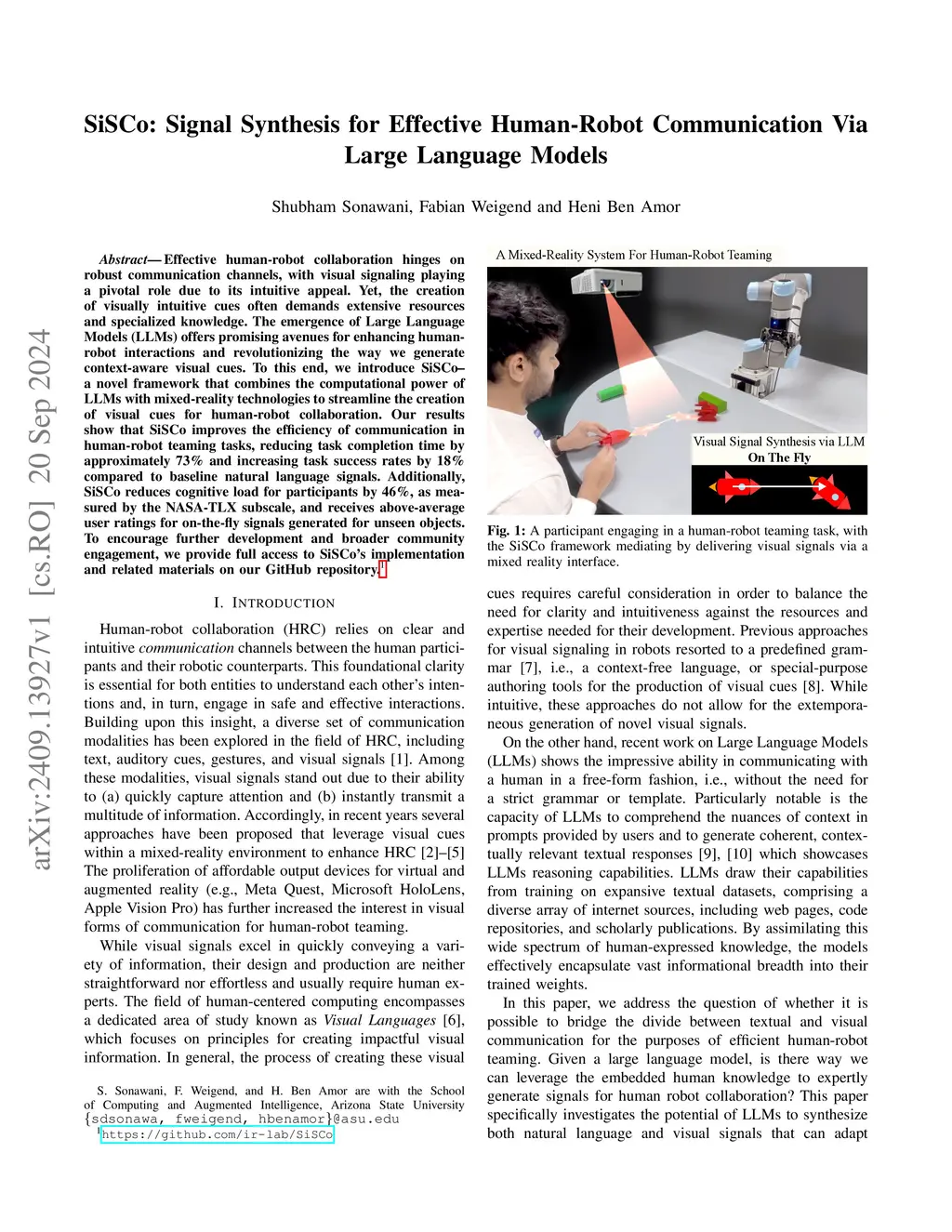 Effective human-robot collaboration hinges on robust communication channels, with visual signaling playing a pivotal role due to its intuitive appeal. Yet, the creation of visually intuitive cues often demands extensive resources and specialized knowledge. The emergence of Large Language Models (LLMs) offers promising avenues for enhancing human-robot interactions and revolutionizing the way we generate context-aware visual cues. To this end, we introduce SiSCo--a novel framework that combines the computational power of LLMs with mixed-reality technologies to streamline the creation of visual cues for human-robot collaboration. Our results show that SiSCo improves the efficiency of communication in human-robot teaming tasks, reducing task completion time by approximately 73% and increasing task success rates by 18% compared to baseline natural language signals. Additionally, SiSCo reduces cognitive load for participants by 46%, as measured by the NASA-TLX subscale, and receives above-average user ratings for on-the-fly signals generated for unseen objects. To encourage further development and broader community engagement, we provide full access to SiSCo's implementation and related materials on our GitHub repository.