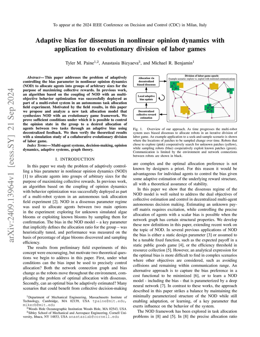 This paper addresses the problem of adaptively controlling the bias parameter in nonlinear opinion dynamics (NOD) to allocate agents into groups of arbitrary sizes for the purpose of maximizing collective rewards. In previous work, an algorithm based on the coupling of NOD with an multi-objective behavior optimization was successfully deployed as part of a multi-robot system in an autonomous task allocation field experiment. Motivated by the field results, in this paper we propose and analyze a new task allocation model that synthesizes NOD with an evolutionary game framework. We prove sufficient conditions under which it is possible to control the opinion state in the group to a desired allocation of agents between two tasks through an adaptive bias using decentralized feedback. We then verify the theoretical results with a simulation study of a collaborative evolutionary division of labor game.