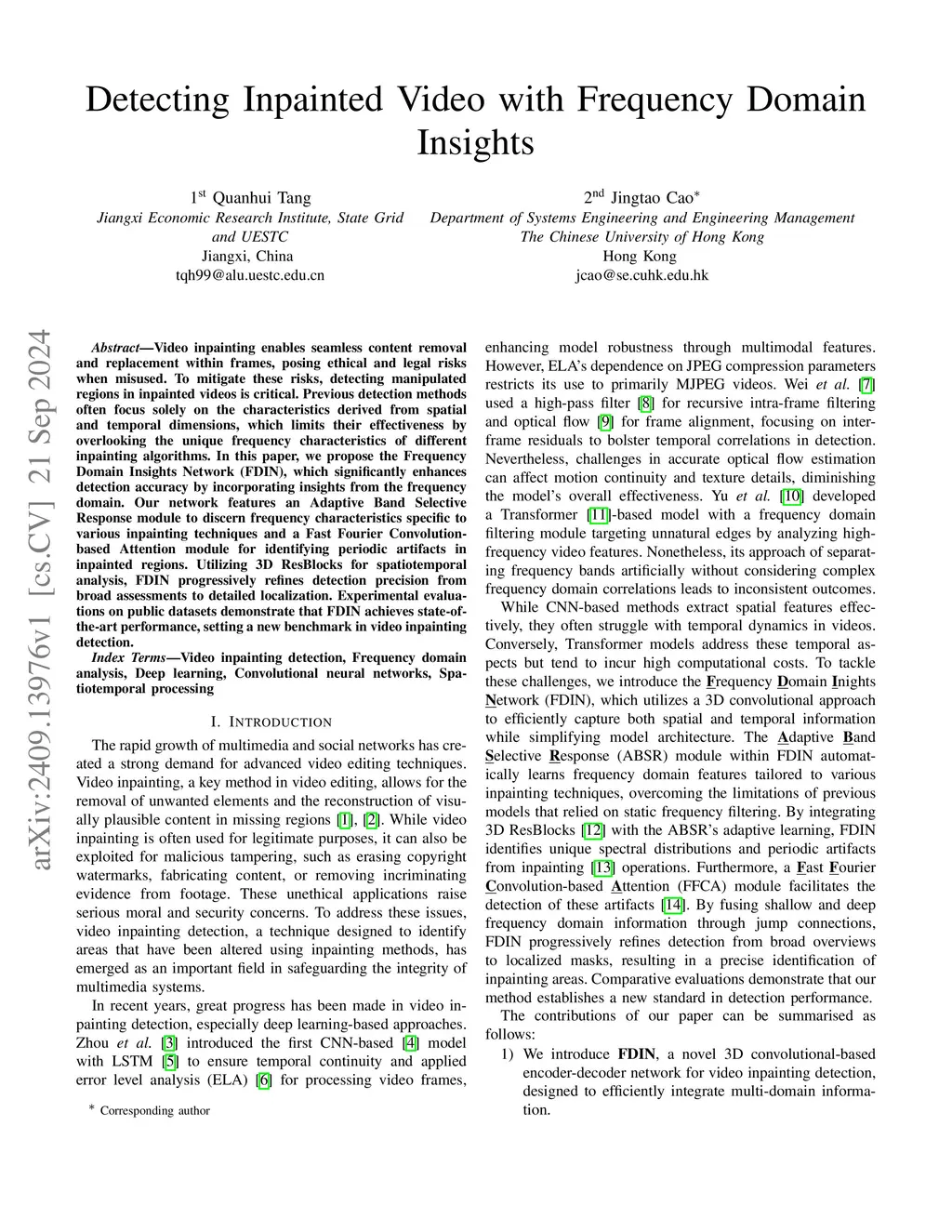 Video inpainting enables seamless content removal and replacement within frames, posing ethical and legal risks when misused. To mitigate these risks, detecting manipulated regions in inpainted videos is critical. Previous detection methods often focus solely on the characteristics derived from spatial and temporal dimensions, which limits their effectiveness by overlooking the unique frequency characteristics of different inpainting algorithms. In this paper, we propose the Frequency Domain Insights Network (FDIN), which significantly enhances detection accuracy by incorporating insights from the frequency domain. Our network features an Adaptive Band Selective Response module to discern frequency characteristics specific to various inpainting techniques and a Fast Fourier Convolution-based Attention module for identifying periodic artifacts in inpainted regions. Utilizing 3D ResBlocks for spatiotemporal analysis, FDIN progressively refines detection precision from broad assessments to detailed localization. Experimental evaluations on public datasets demonstrate that FDIN achieves state-of-the-art performance, setting a new benchmark in video inpainting detection.