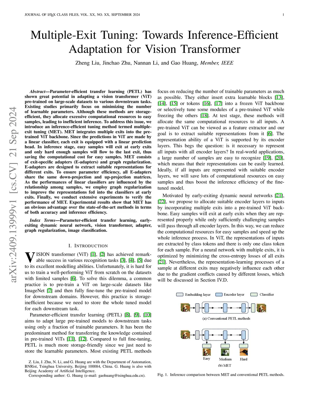 Parameter-efficient transfer learning (PETL) has shown great potential in adapting a vision transformer (ViT) pre-trained on large-scale datasets to various downstream tasks. Existing studies primarily focus on minimizing the number of learnable parameters. Although these methods are storage-efficient, they allocate excessive computational resources to easy samples, leading to inefficient inference. To address this issue, we introduce an inference-efficient tuning method termed multiple-exit tuning (MET). MET integrates multiple exits into the pre-trained ViT backbone. Since the predictions in ViT are made by a linear classifier, each exit is equipped with a linear prediction head. In inference stage, easy samples will exit at early exits and only hard enough samples will flow to the last exit, thus saving the computational cost for easy samples. MET consists of exit-specific adapters (E-adapters) and graph regularization. E-adapters are designed to extract suitable representations for different exits. To ensure parameter efficiency, all E-adapters share the same down-projection and up-projection matrices. As the performances of linear classifiers are influenced by the relationship among samples, we employ graph regularization to improve the representations fed into the classifiers at early exits. Finally, we conduct extensive experiments to verify the performance of MET. Experimental results show that MET has an obvious advantage over the state-of-the-art methods in terms of both accuracy and inference efficiency.