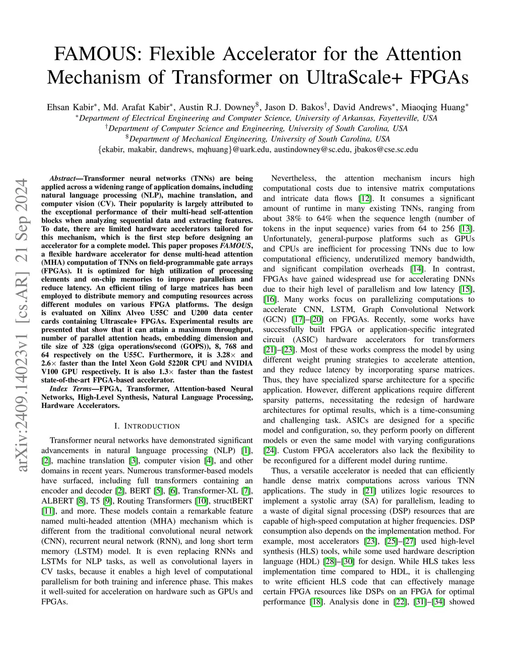 FAMOUS: Flexible Accelerator for the Attention Mechanism of Transformer on UltraScale+ FPGAs