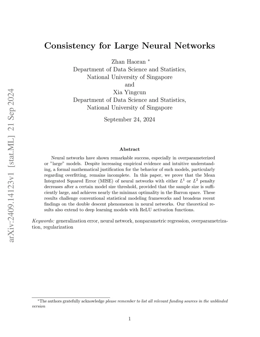 Although overparameterized models have achieved remarkable practical success, their theoretical properties, particularly their generalization behavior, remain incompletely understood. The well known double descents phenomenon suggests that the test error curve of neural networks decreases monotonically as model size grows and eventually converges to a non-zero constant. This work aims to explain the theoretical mechanism underlying this tail behavior and study the statistical consistency of deep overparameterized neural networks in many different learning tasks including regression and classification. Firstly, we prove that as the number of parameters increases, the approximation error decreases monotonically, while explicit or implicit regularization (e.g., weight decay) keeps the generalization error existing but bounded. Consequently, the overall error curve eventually converges to a constant determined by the bounded generalization error and the optimization error. Secondly, we prove that deep overparameterized neural networks are statistical consistency across multiple learning tasks if regularization technique is used. Our theoretical findings coincide with numerical experiments and provide a perspective for understanding the generalization behavior of overparameterized neural networks.