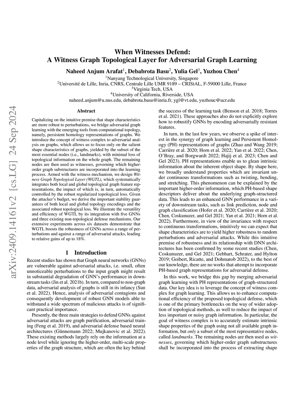 When Witnesses Defend: A Witness Graph Topological Layer for Adversarial Graph Learning